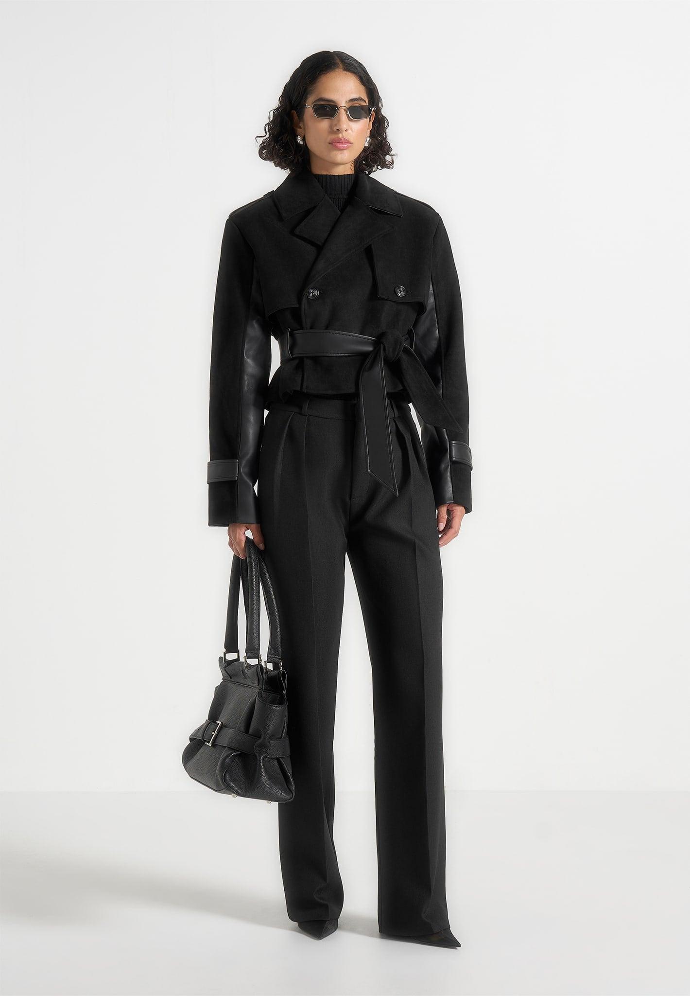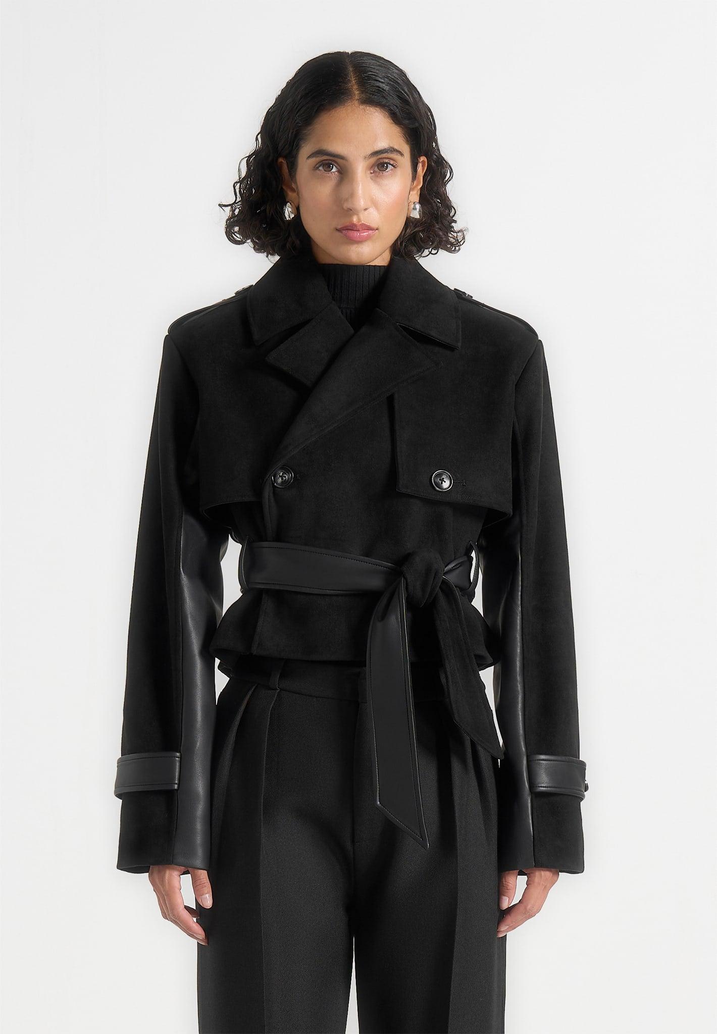 This cropped jacket is defined by the rich texture of soft suede, offering a refined yet contemporary feel. Its structured silhouette is balanced with a sharp lapel collar and shoulder epaulets for tailored definition, while contrasting vegan leather panels introduce depth and edge. A detachable belt allows for personalised waist shaping, making it a versatile piece that transitions seamlessly from everyday wear to statement styling. Crafted from soft suede for a textured finish Cropped jacket silhouette for a structured look Lapel collar for a clean, tailored finish Shoulder epaulets for a defined, elevated detail Contrasting vegan leather panels for added texture and edge Detachable belt for personalised waist definition Tonal Manière De Voir vegan leather Eiffel patch to centre back