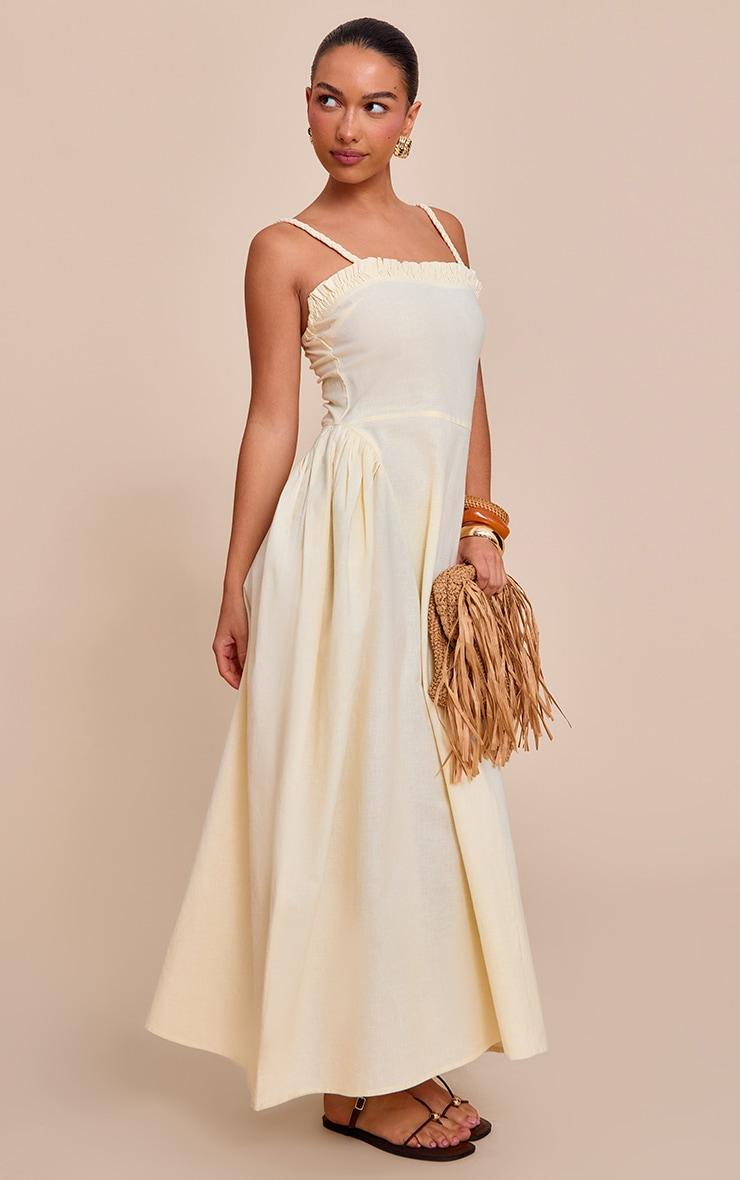 Master effortless day styling with an essential piece that speaks volumes. The lemon braided v waist midaxi dress perfects your warm-weather wardrobe with its distinctive strapless design, featuring a delicate shirred ruffle neckline and unique braided straps. An artful V-waist detail creates a defined silhouette, leading to a gracefully flared midaxi skirt. Elevate your look with simple flat sandals and a statement ear cuff, or layer with a lightweight trench for chic transitional styling, solidifying a polished, self-assured ensemble.Length approx 134.5cm/53inch (Based on sample size US 4)Model wears size UK 8/ EU 36/ AUS 8/ US 4Model Height - 5ft 7inchp]:!mb-4inch>Brand: PrettyLittleThingCategory: DressesProduct type: Shift DressColor: LemonMaterial: Woven CrepeDesign: PlainNeckline: Straight NeckSleeves: Spaghetti StrapOccasion: Day
