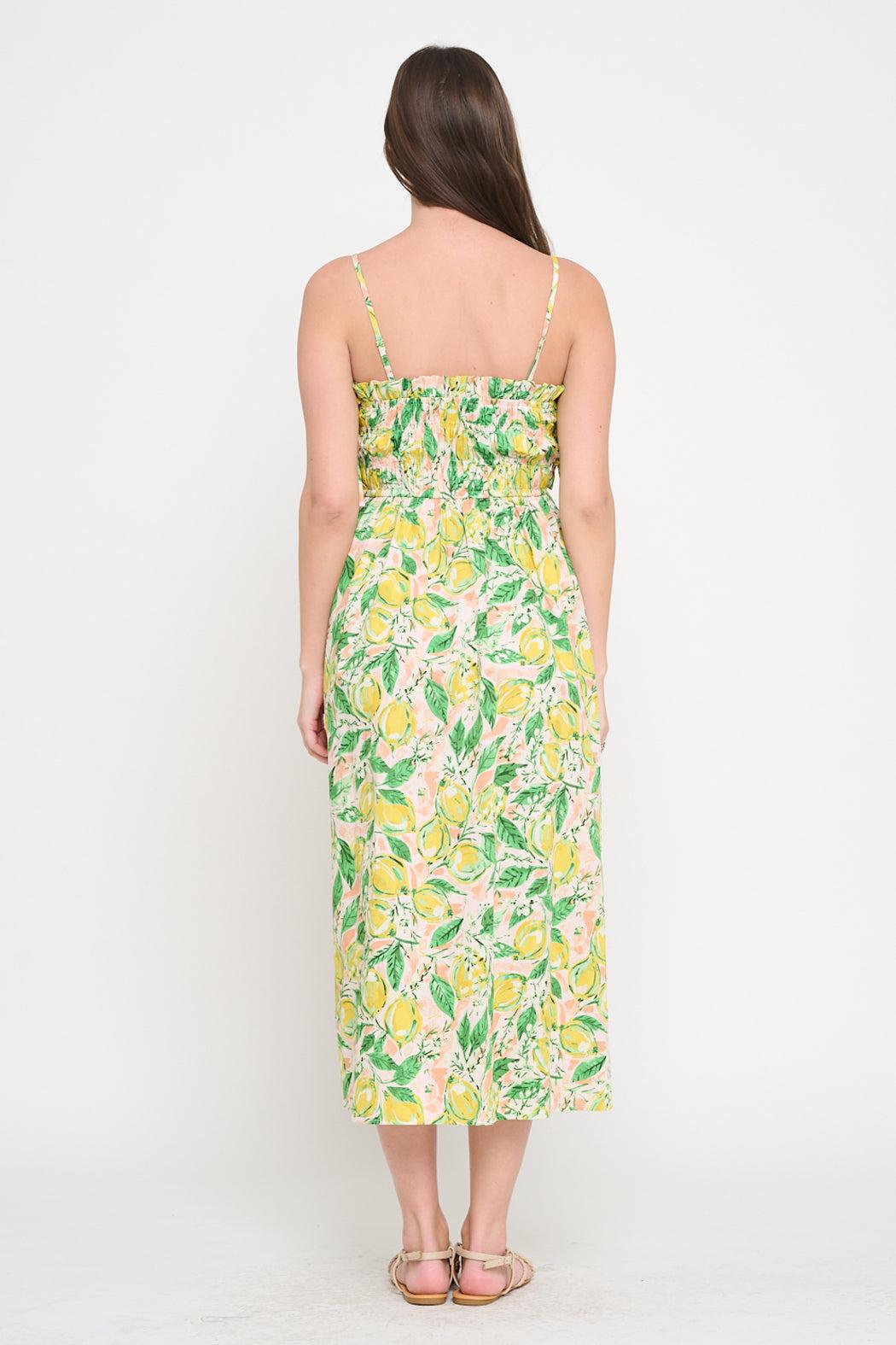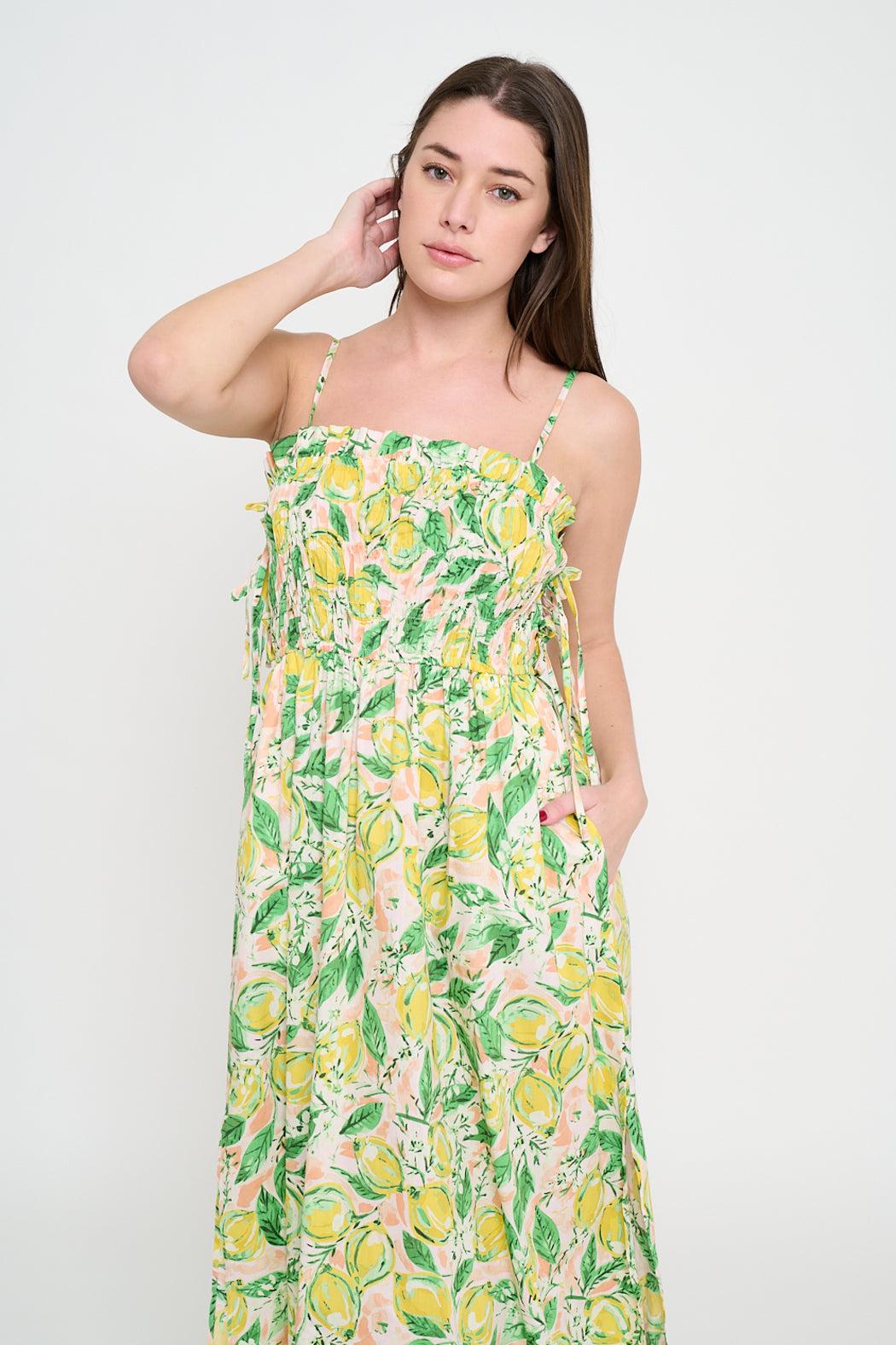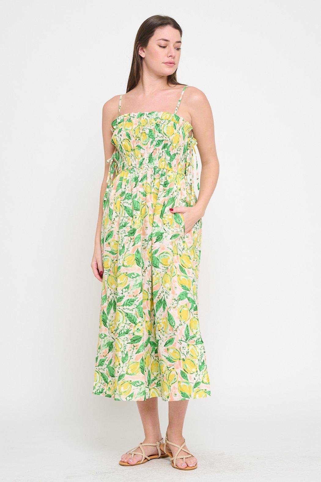 This breezy and stylish midi dress is a must-have for your boutique's spring and summer lineup. Designed with a smocked bodice for a flattering fit, this dress features adjustable spaghetti straps and side tie details, offering a touch of versatility and charm. The vibrant citrus print adds a refreshing, vacation-ready vibe, perfect for any warm-weather occasion.