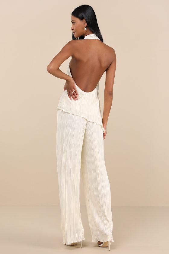 With a chic set like this plisse-pleated two-piece jumpsuit, styling is effortless and compliments come easily. The longline top features a high halter neckline, a sultry low-cut back design, and an asymmetrical hem. The matching wide-leg pants boast an elasticized waistband and full-length hems with lettuce-edge trim.