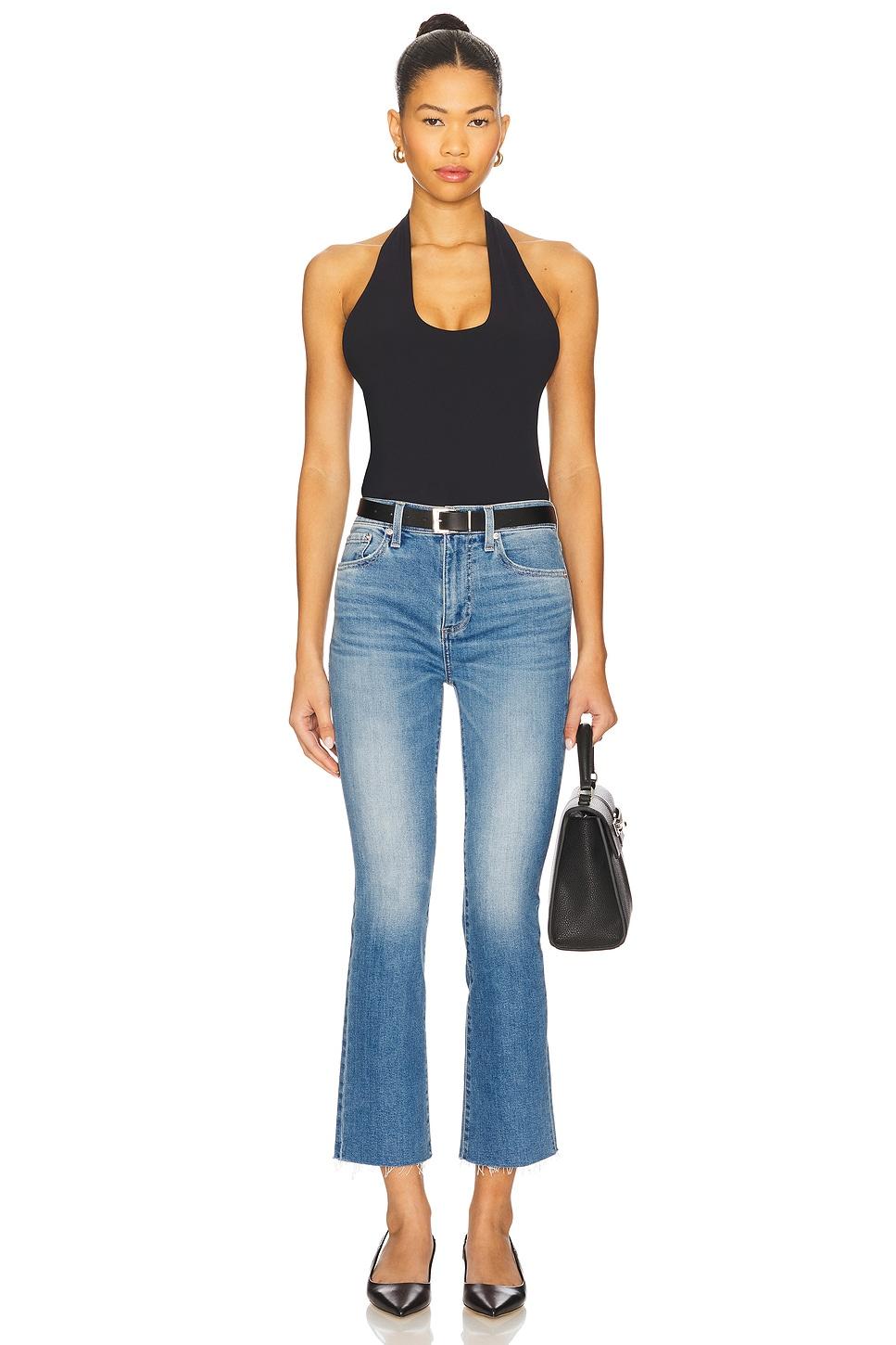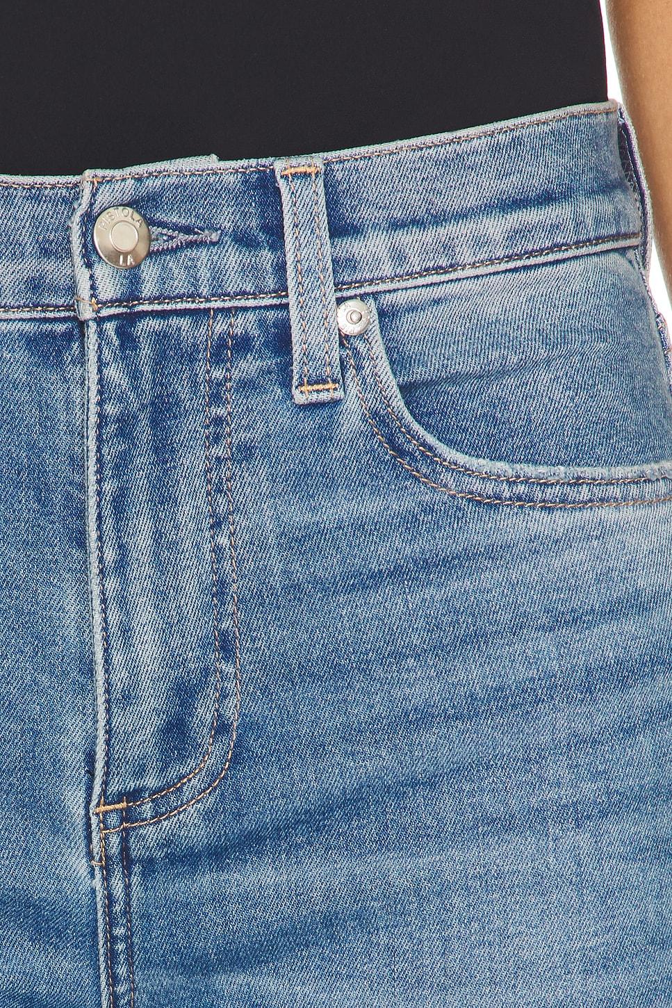 94% cotton, 5% polyester, 1% elastane. Machine wash. Zip fly with button closure. 5-pocket styling. Logo patch at back waist. Intentional whiskering and fading. Slightly stretch denim fabric with frayed raw hem. 16" at the leg opening. Made in China. Revolve Style No. PSTL-WJ397. Manufacturer Style No. P00016088-SJ.