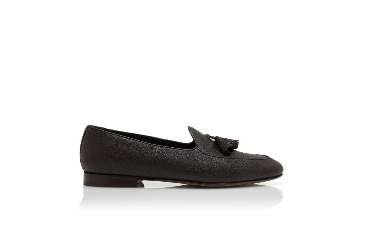 Dark Brown calf leather loafers featuring apron cut design and tassel design detail.