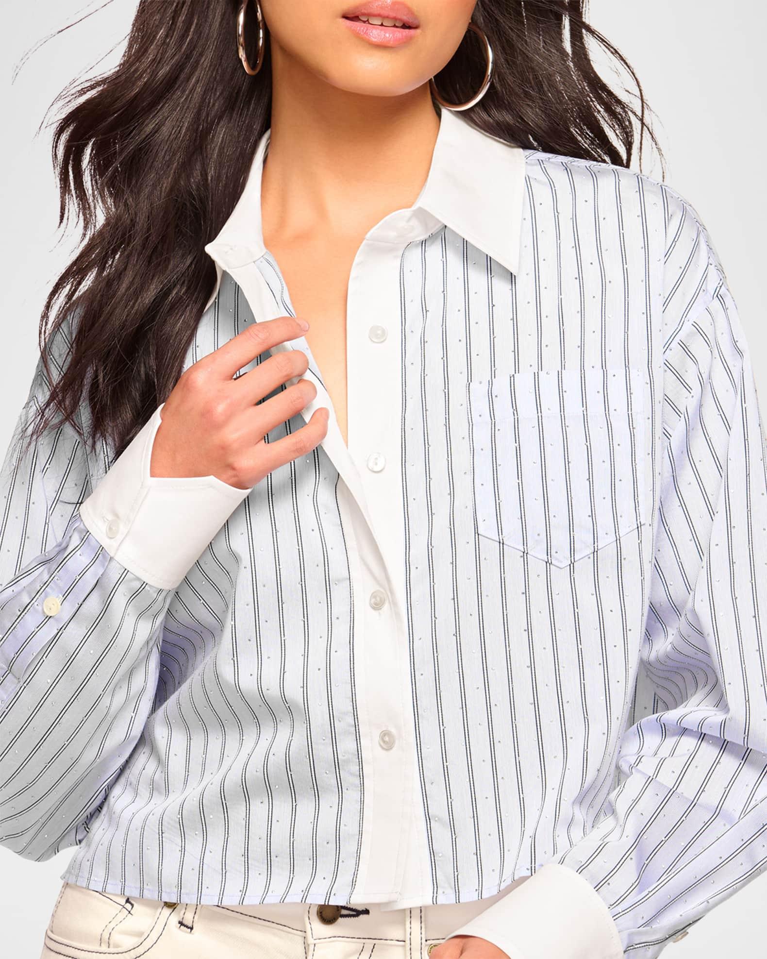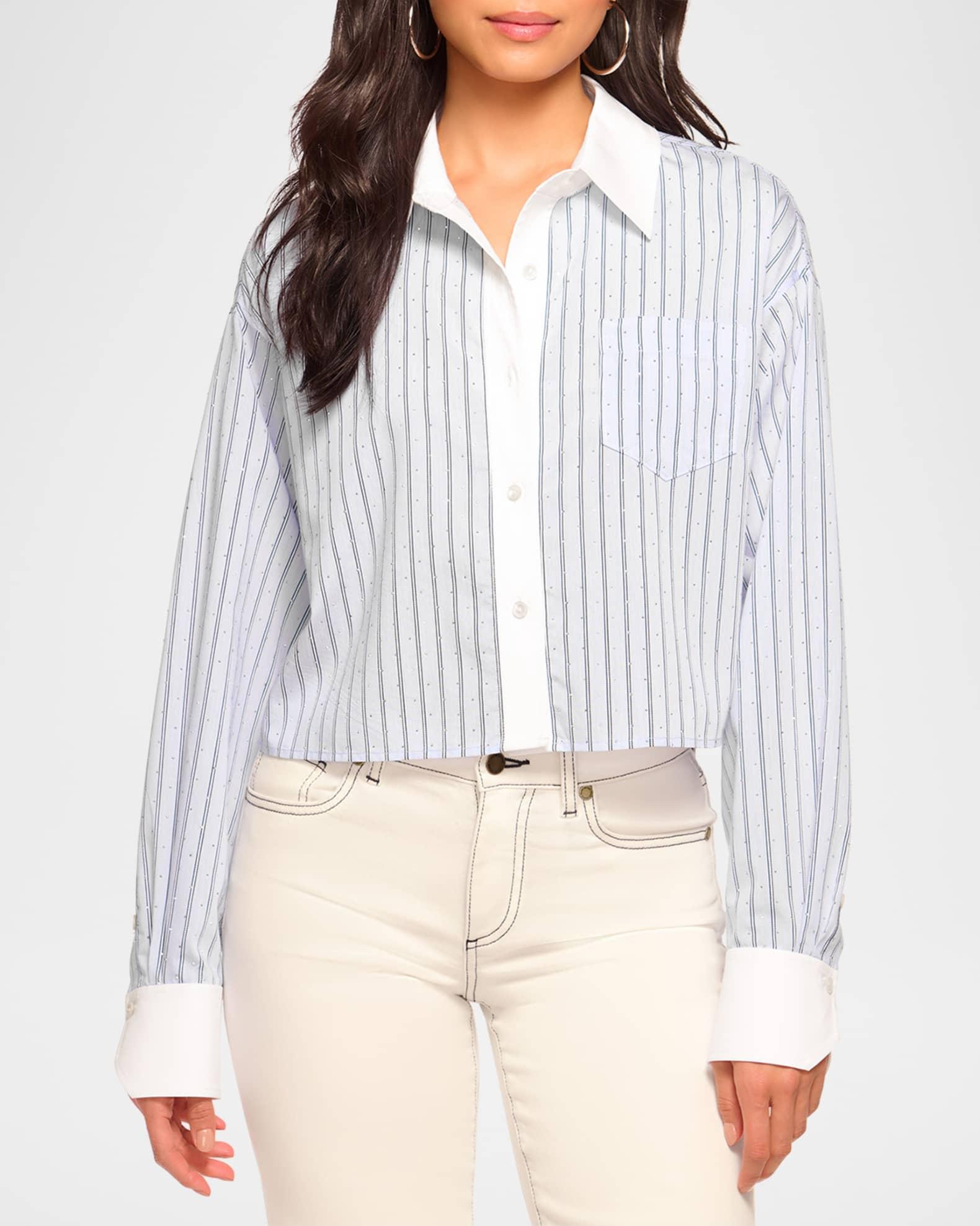 Ramy Brook "Lennox" embellished stripe shirt with contrast trim Approx. 23"L from shoulder to hem Point collar Long sleeves with button cuffs Chest pocket Classic fit Hem sits at the hip Button-front Rayon/cellulose acetate/Tencel® lyocell/nylon/polyamide Dry clean Imported