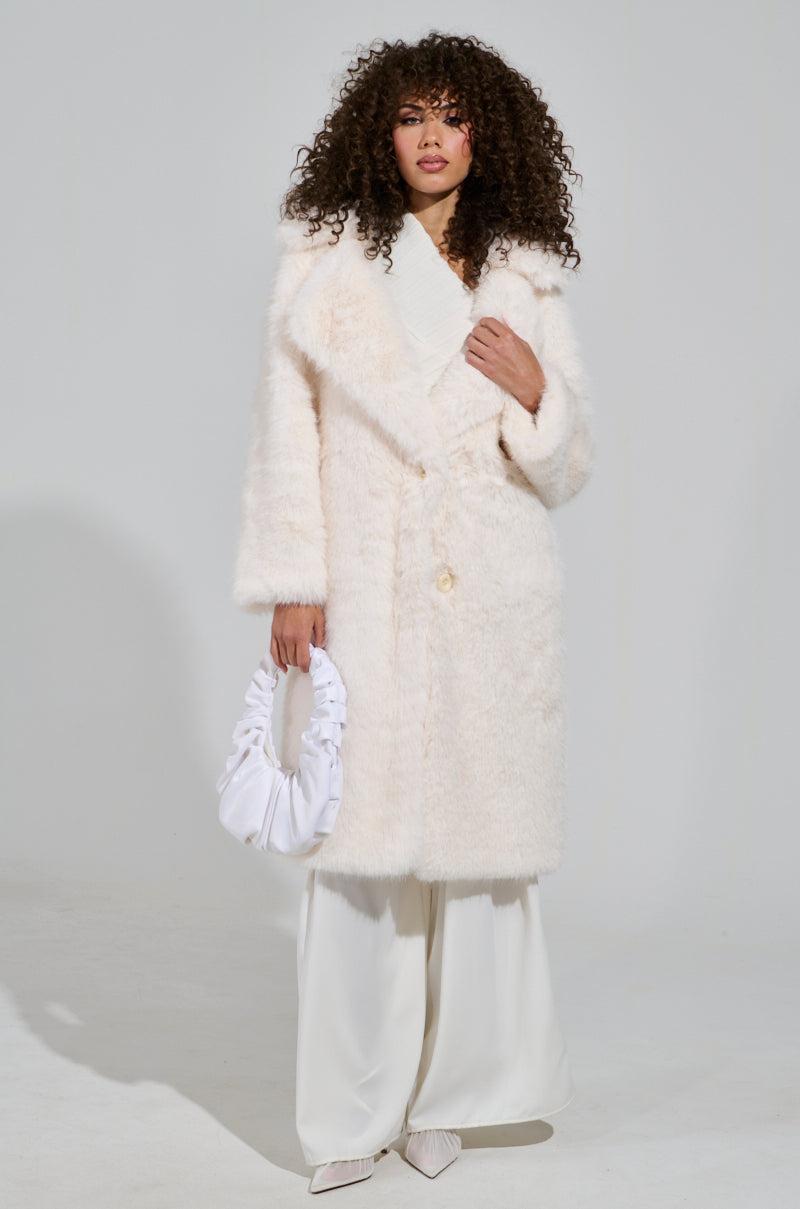 Look and feel like a cloud in The AKIRA Label Lenox Faux Fur Trench In Ivory. This sumptuous outerwear piece is crafted from a silky smooth faux fur fabrication and features an oversized notch lapel collar, long sleeves, a single button closure, side slant pockets, and a tonal quilted inner lining. Complete with a longline silhouette. Pair with a cable knit sweater, flared jeans, and stiletto booties for a snowy chic look. - 100% Acrylic- No Stretch- Imported (all measurements approximate from size S/M)- 44” Shoulder to Hem- 23” Sleeves- 19” Shoulder to ShoulderProduct ID: 465818 (all measurements approximate from size 1X/2X)- 46” Shoulder to Hem- 25” Sleeves- 21” Shoulder to ShoulderProduct ID: 465820