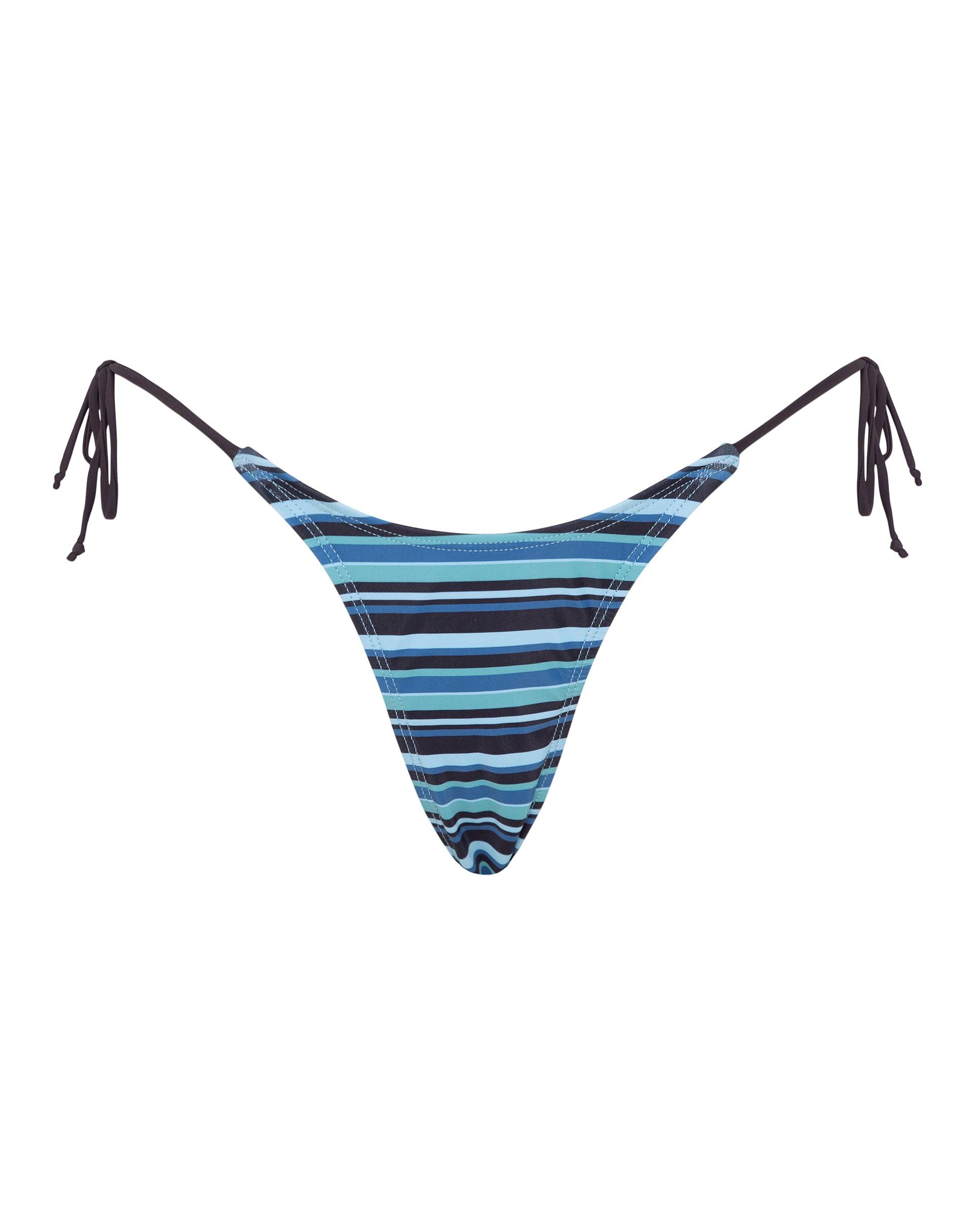 In a tonal blue horizontal stripe, the Lentra bikini bottom feature a low rise, brazilian cut design with brown tie straps at each side for an adjustable fit. Pair with our matching Pami bikini top. MODEL WEARS SIZE:EXTRA SMALL - MODEL HEIGHT:5'7
