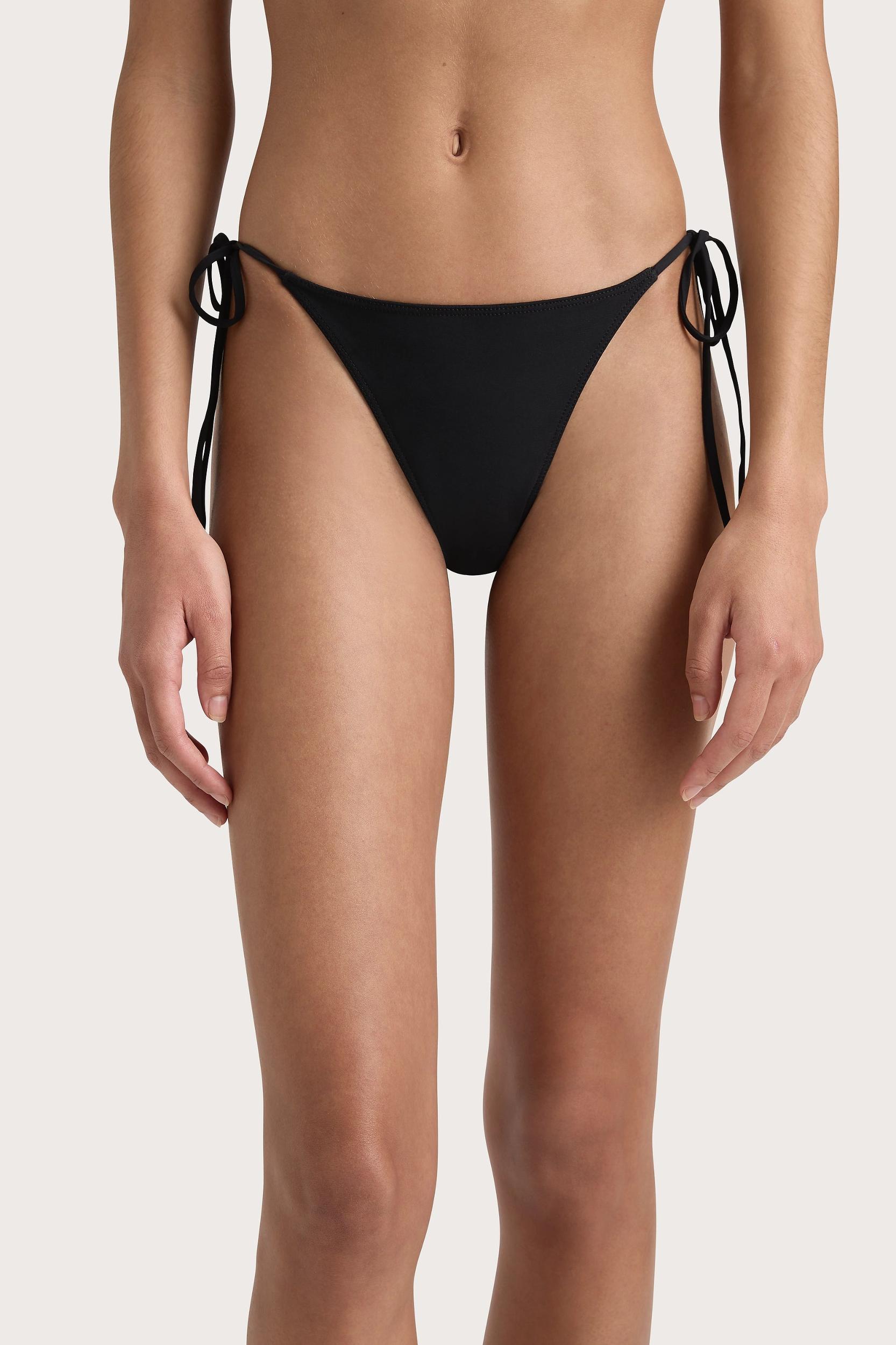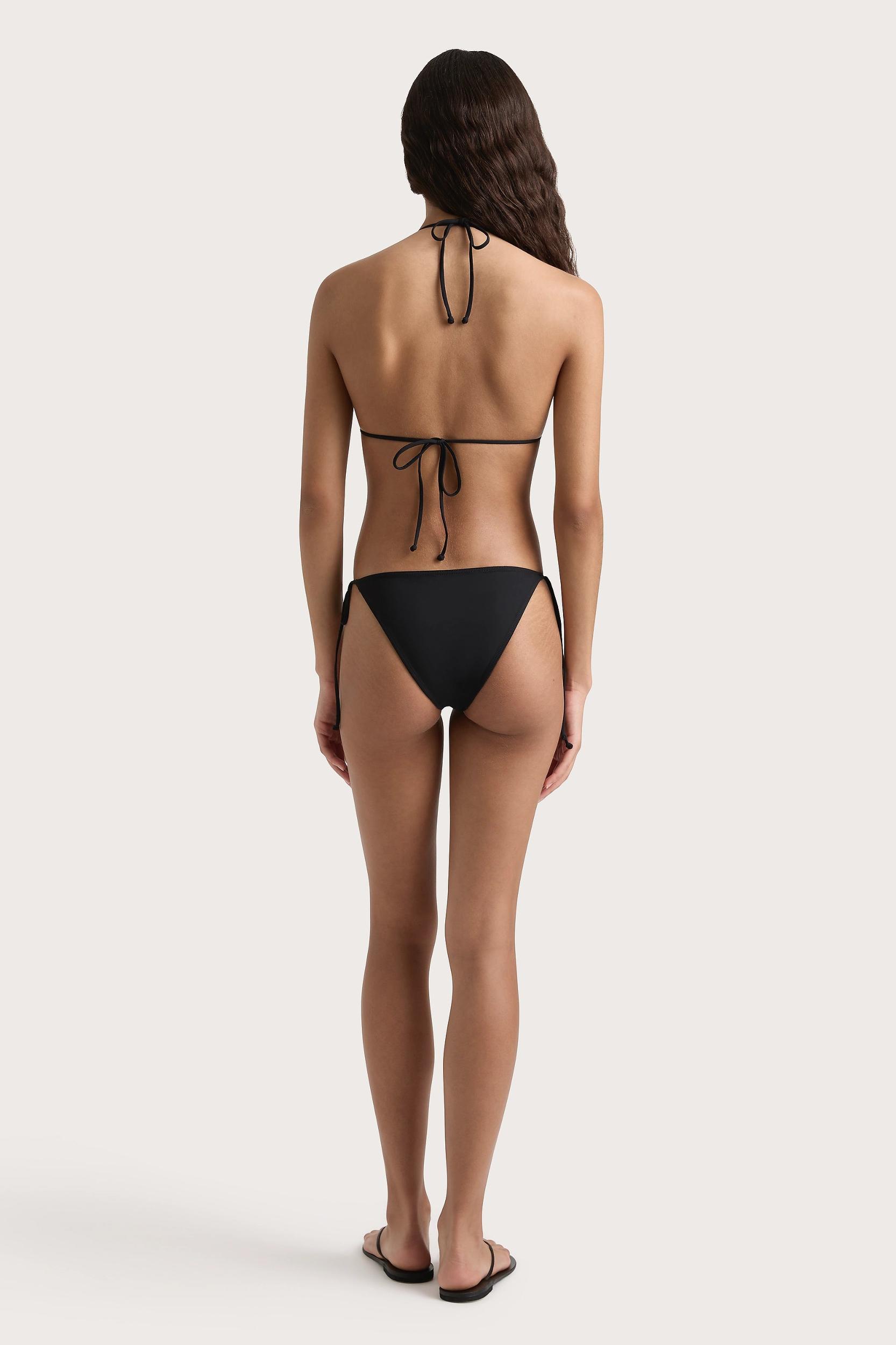 A classic triangle bikini bottom with side ties, allowing for a custom fit. Fully lined, it is designed in a black colourway. Style with the matching Sete Bikini Top. This style is true to size and offers medium coverage. Please note the ties do allow for adjustability.