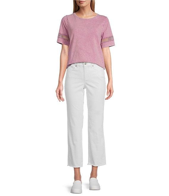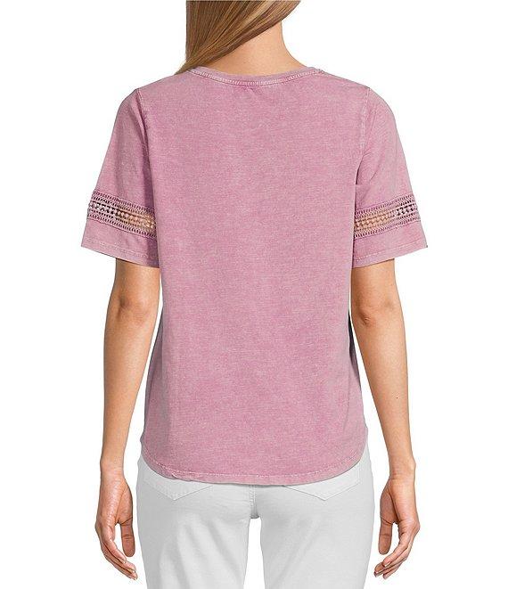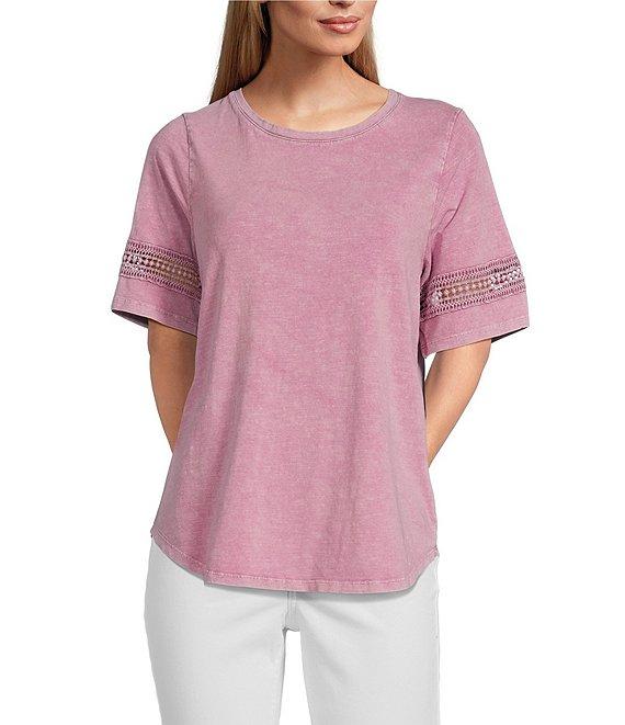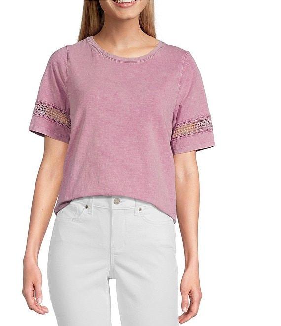 Leo & Nicole Acid Wash Crew Neck Short Sleeve Crochet Trim Knit Tee