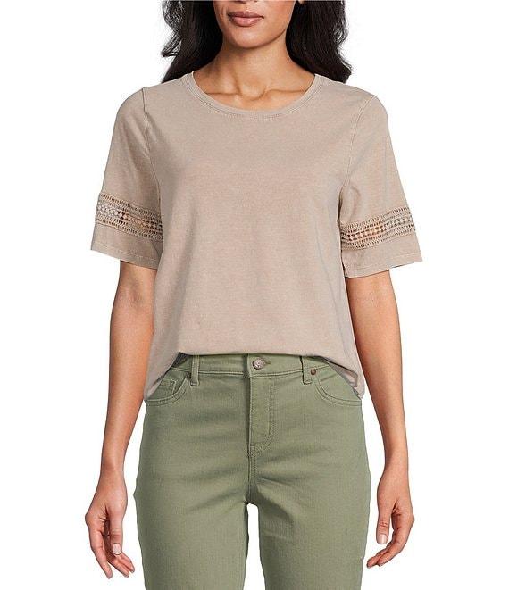 From Leo & Nicole, this tee features: Knit fabrication Crew neckline Short sleeves Relaxed fit Crochet trim on sleeves Round hem Pullover construction Cotton/spandex Machine wash/tumble dry Imported.