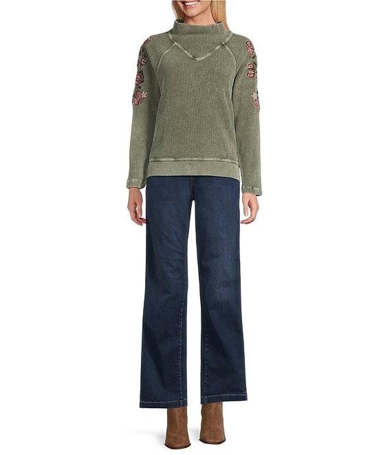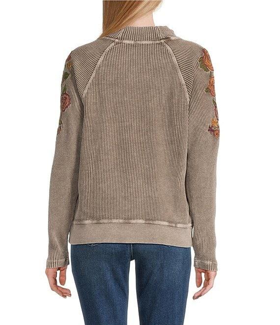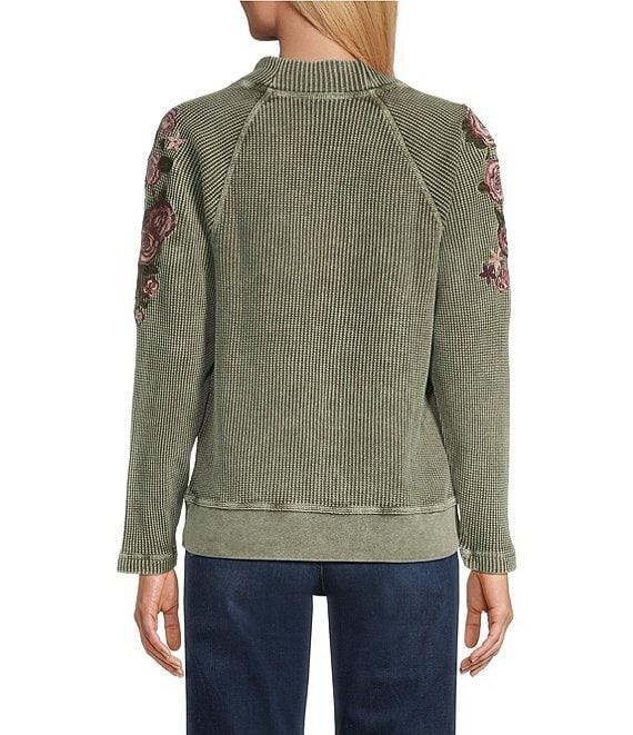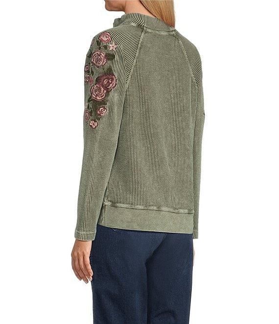 Leo & Nicole Embroidered Mock Neckline Long Sleeve Waffle Acid Wash Top