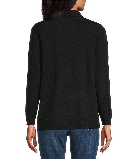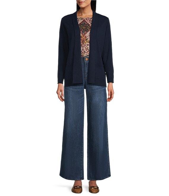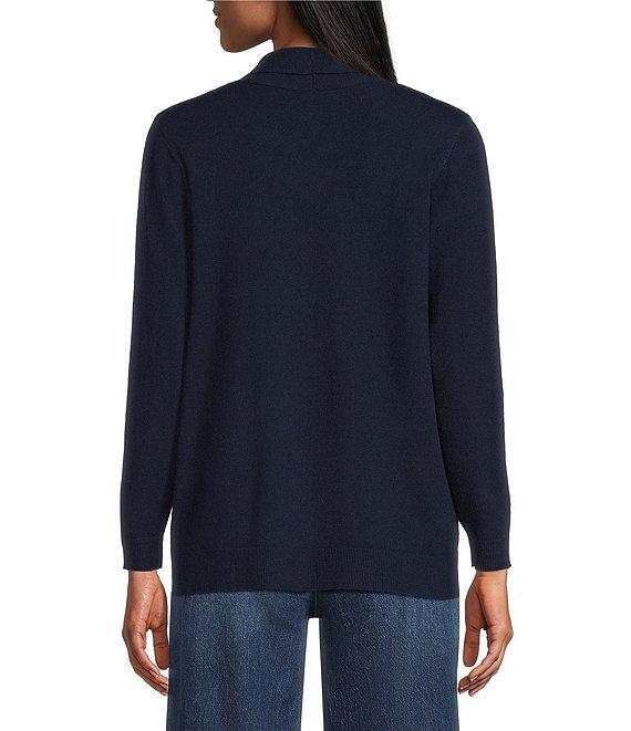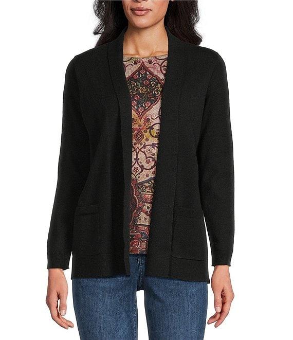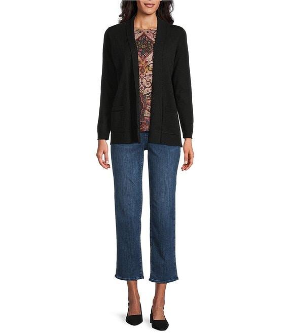 From Leo & Nicole Petite, this cardigan features: Shawl collar Long sleeves Relaxed fit Two front patch pockets Straight hem Open-front; no closure Approx. 26" length Viscose/nylon/polyester Machine wash/tumble dry Imported.