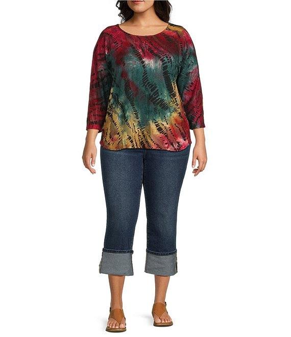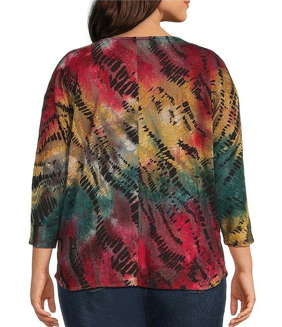 Leo & Nicole Plus Size Jacquard Multi Color Print Crew Neck 3/4 Dolman Sleeve Top
