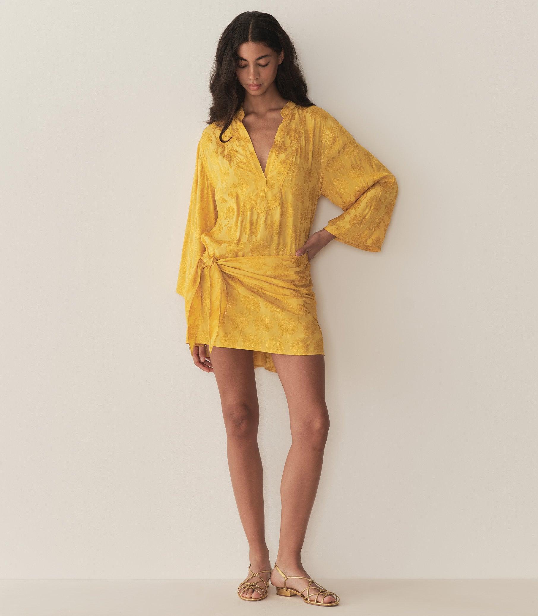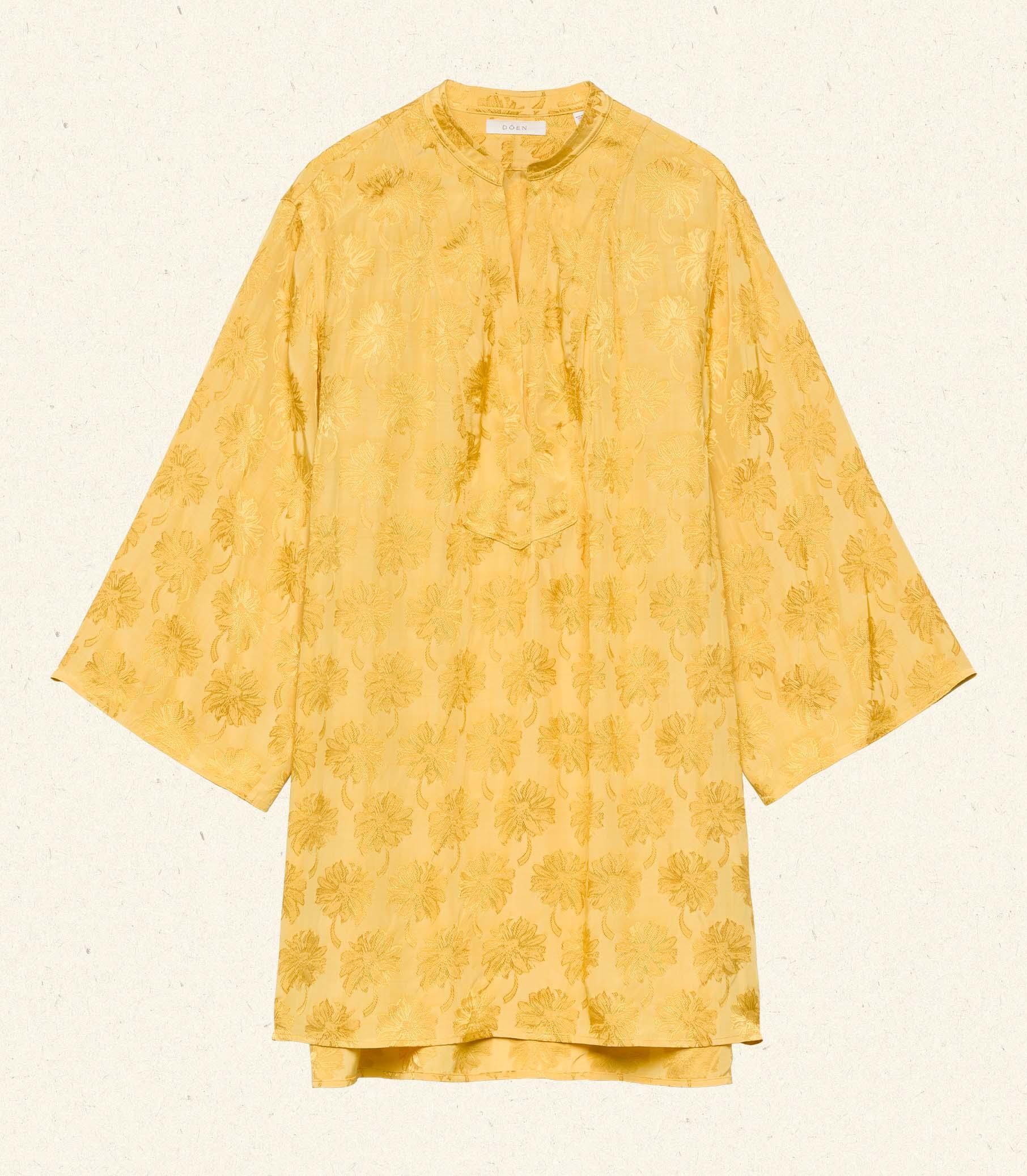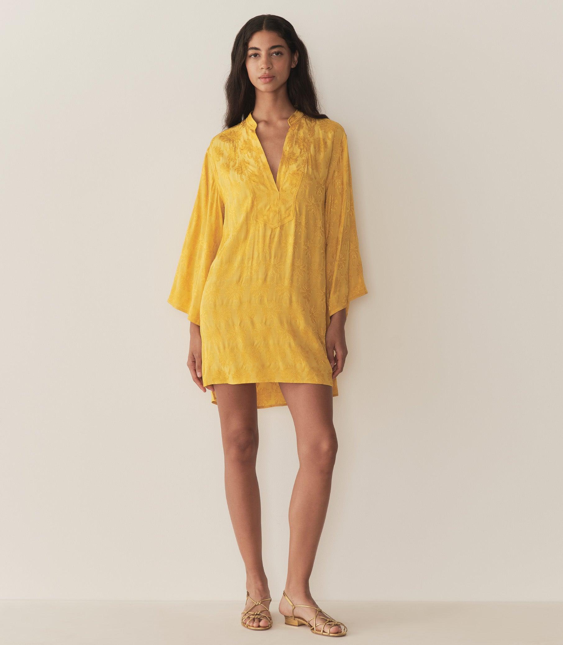 In floral jacquard reminiscent of a vintage tunic from our content team's personal collection, the Leona Dress features a high neck with a Nehru collar, three-quarter-length bell sleeves, and a gently flared A-line silhouette. The Leona comes with a matching detachable scarf that can be tied as a belt for a cinched look.