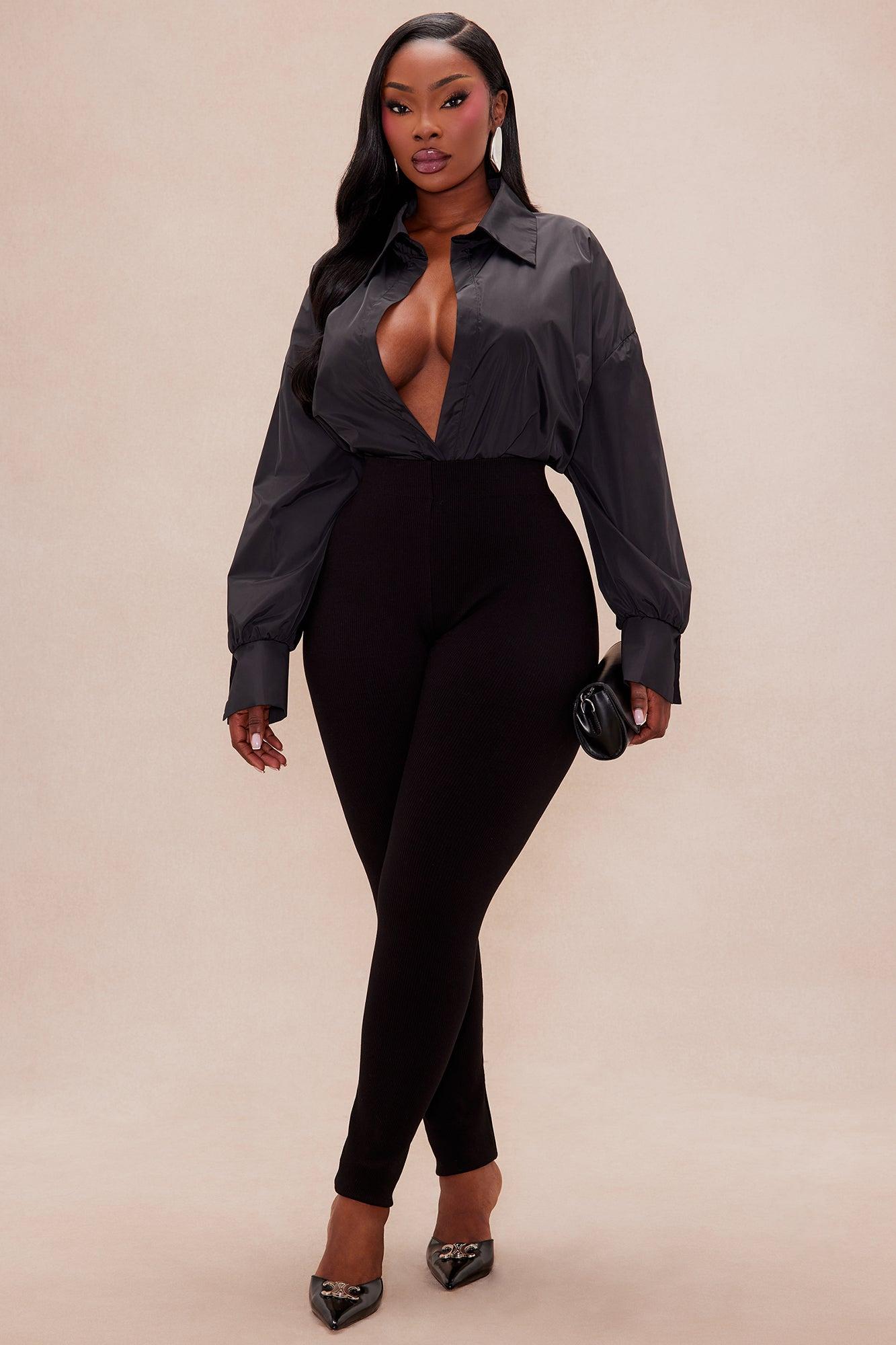 Available In Black. Bodysuit Long Sleeve Collared Snap Button Closure Final sale Non Stretch Shell: 100% Polyester Contrast: 82% Nylon 18% Spandex Imported California Proposition 65WARNING: Cancer and Reproductive Harm - www.P65Warnings.ca.gov.