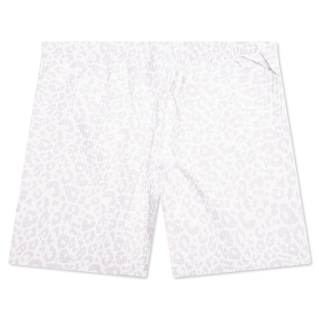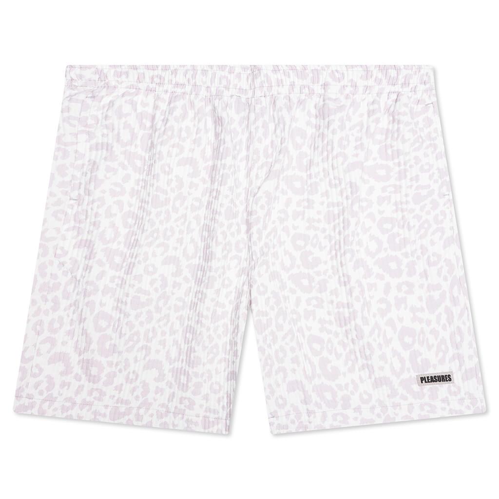 Pleasures introduces the Leopard Active Shorts in its latest collection. Made from polyester, these shorts are built to handle everything from daily wear to high-energy adventures. Featuring an elastic waistband with internal drawstrings for a secure fit, and side and rear pockets for utility storage. The look is completed with an all-over leopard print design for a bold statement and a woven label tab on the front leg. 100% Polyester Elastic waistband with internal drawstring Side-entry pockets Rear welt pocket Woven label tab Style no: P25SU033-WHITE P25SU033 WHIT