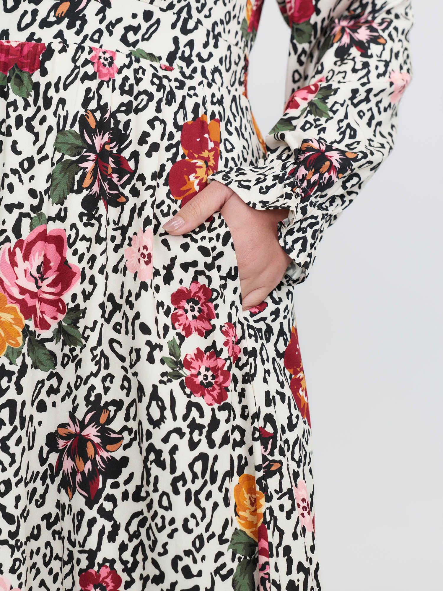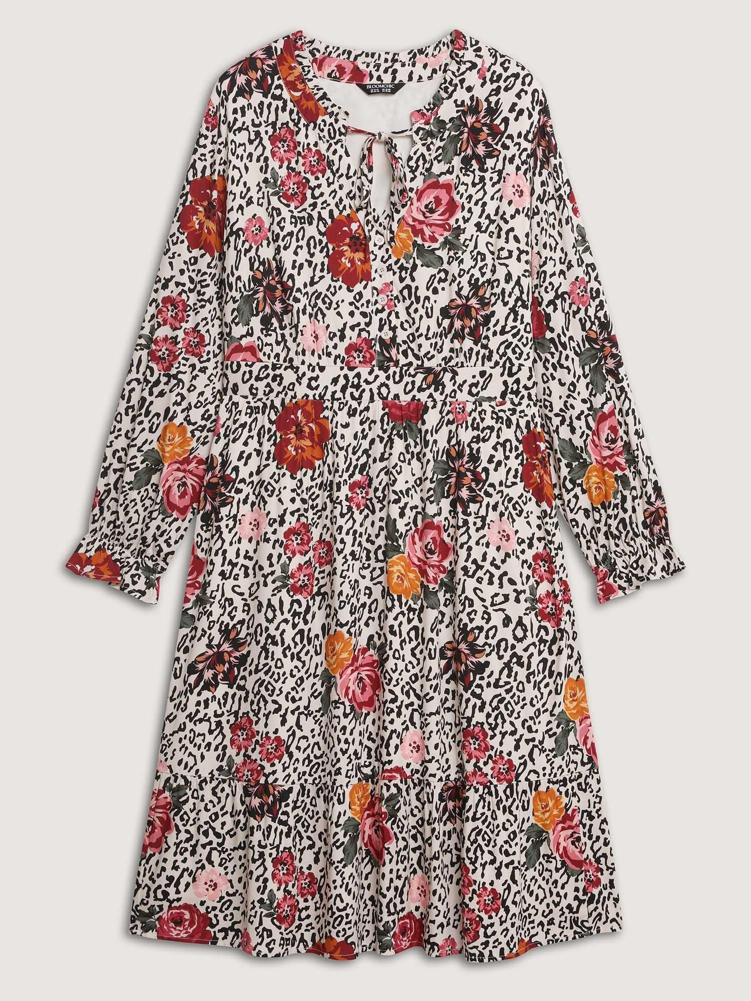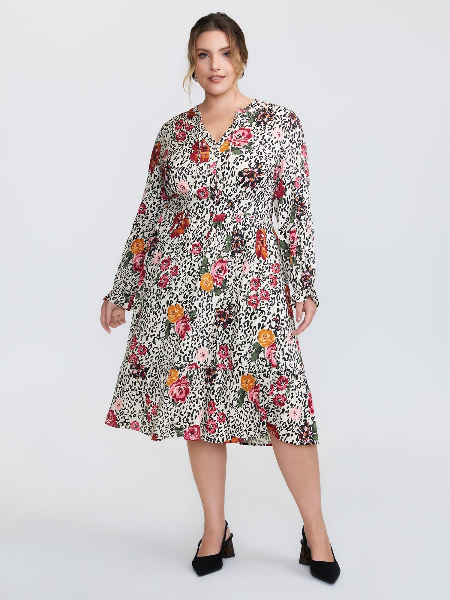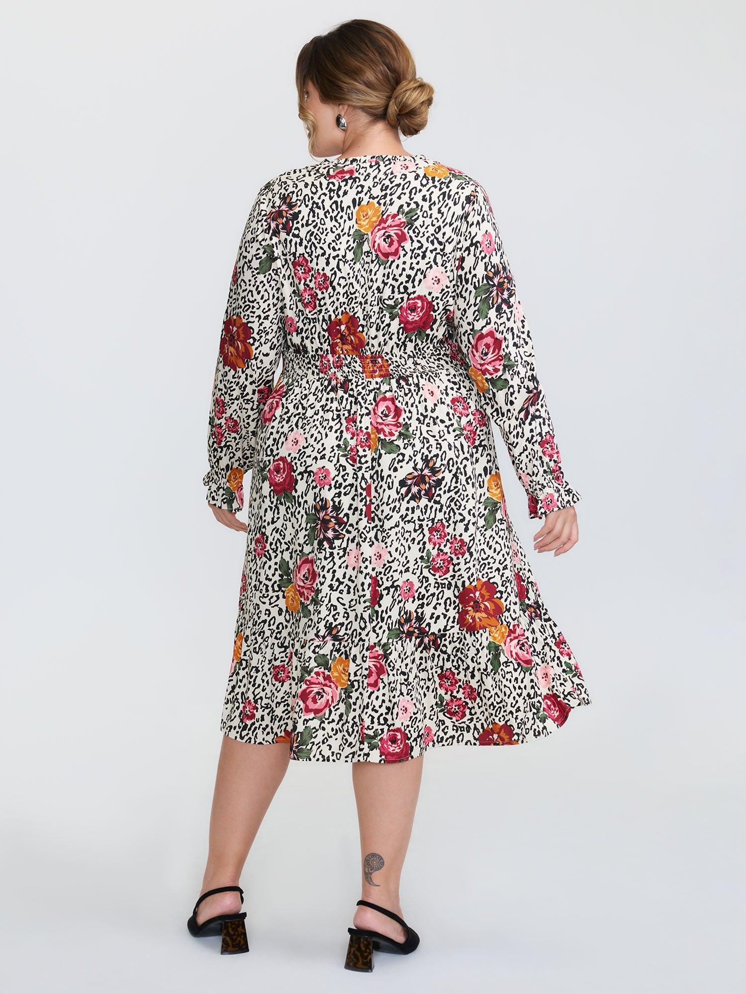 Shop Leopard Floral Print Shirred Waist Midi Dress now and redefine your style with confidence at BloomChic. Tailored for mid and plus-size women. This trendy Dress, sizes 10-30. You can never go wrong with BloomChic Dresses. Color:Apricot;Style:Timeless;Neckline:Flat collar with V-notch;Sleeve Type:Elastic cuff;Prints:Floral;Details:Tie knot, Ruffles, Shirred;Pocket:Side seam pocket;Belt:No-belt;Closure Type:False placket