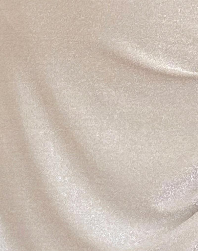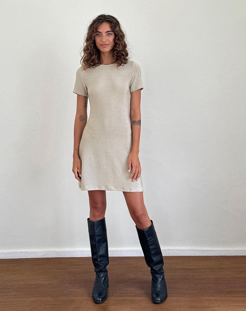In silver mink, the Leora dress features short sleeves and a crew neckline with loose a-line fit in a mini length. MODEL WEARS SIZE: EXTRA SMALL - MODEL HEIGHT:5'7