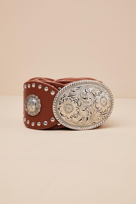 Designed to make any OOTD even more iconic, this Western-inspired belt features a smooth, faux leather construction and a slightly oversized silhouette created with sleek disc segments. Studded details and floral medallions define the rodeo-ready look, while a large engraved buckle lends the perfect finish.