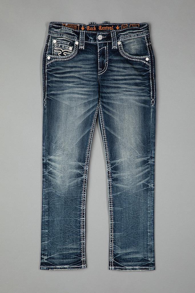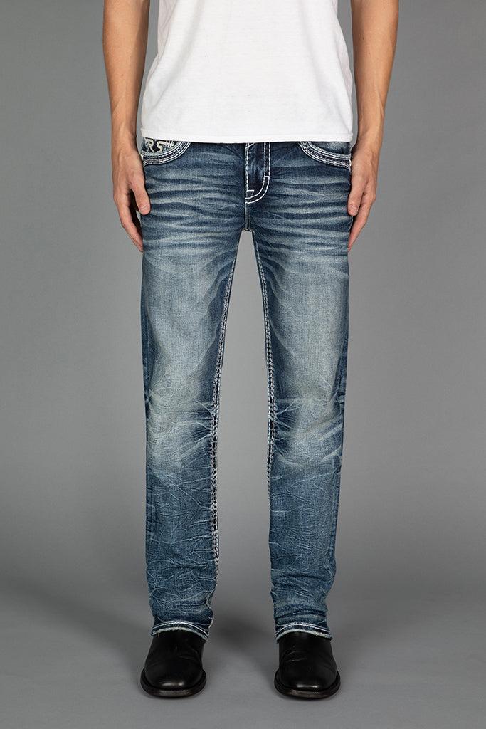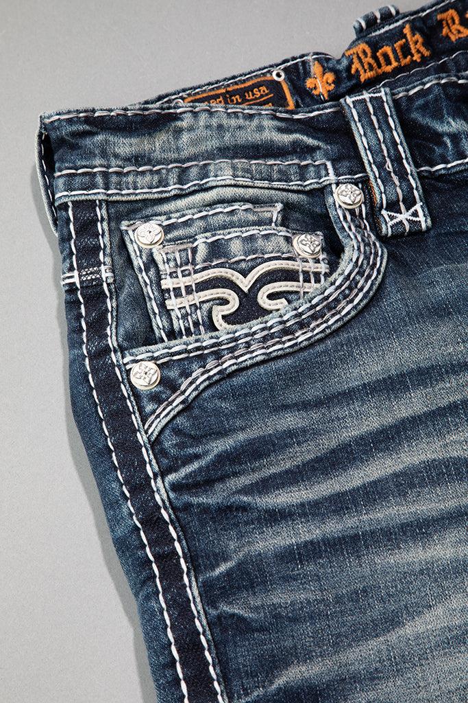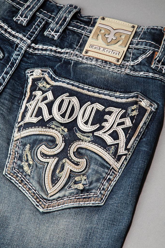 Silver white brushed hardware with inverted Fleur de Lis back pockets and navy stitching. Rock brand name in white leather. Beige and khaki leather belt loop patch. Designed with care and creativity in Los Angeles, California.
