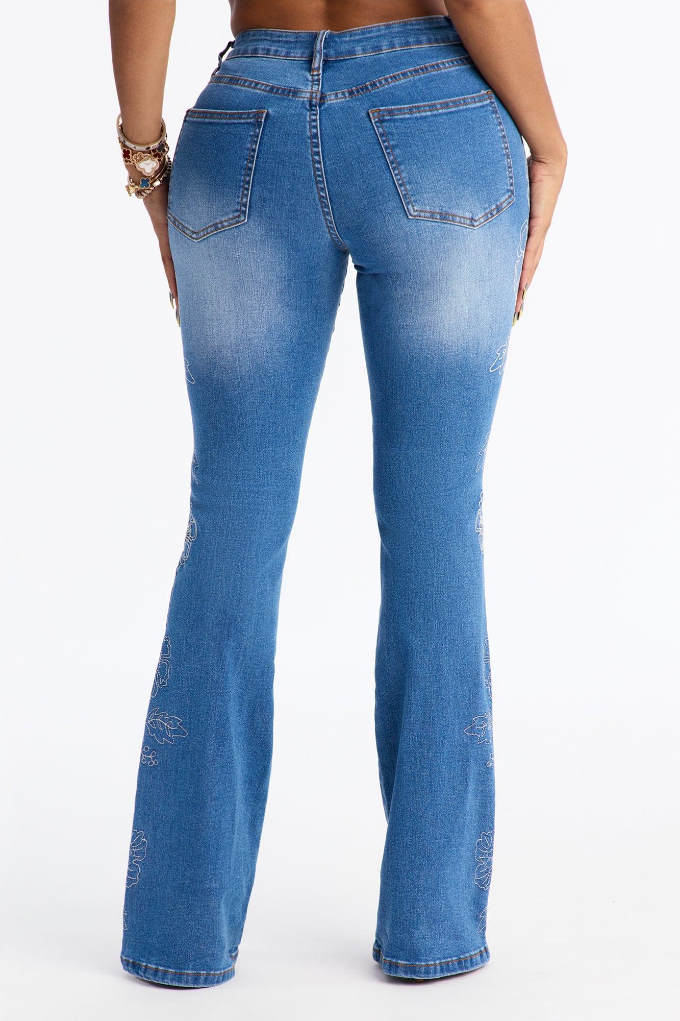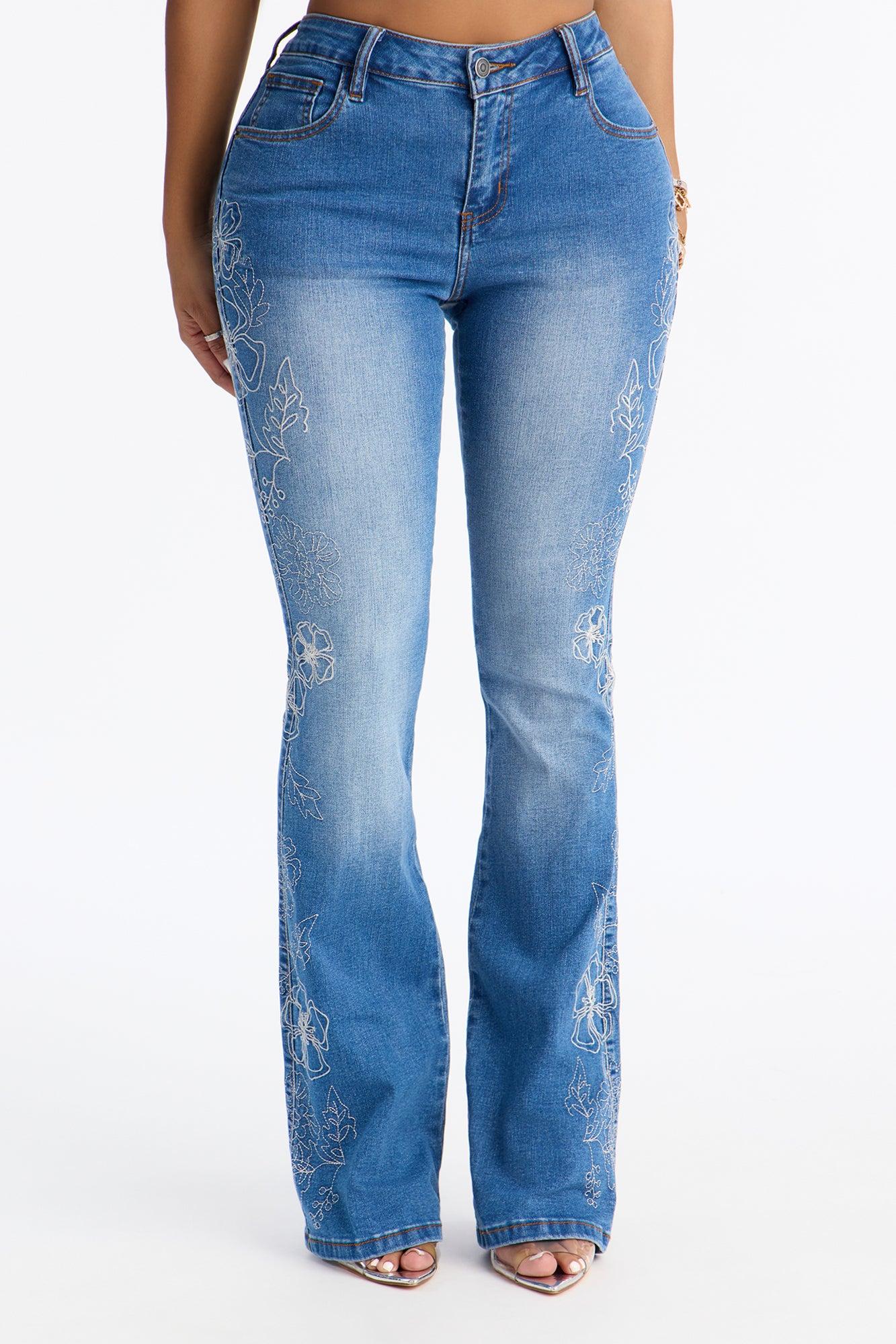 Available In Medium Wash. Flare Leg Jean 5 Pocket Embroidered 9" Rise 34" Inseam Low Stretch Disclaimer : Embroidery Placement Will Vary. Self: 74% Cotton 23% Polyester 2% Viscose 1% Spandex Imported California Proposition 65WARNING: Cancer and Reproductive Harm - www.P65Warnings.ca.gov.