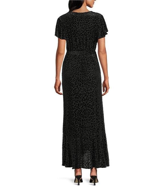 From Leslie Fay, this dress features: Burnout fabrication V-neckline Short flutter sleeves Ruffle hem detail Faux wrap silhouette Asymmetrical hem Lined Center back zipper closure Approx. 54.5" in length Nylon/polyester/spandex Hand wash/line dry Imported.