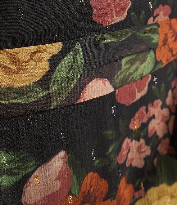 Leslie Fay Jacquard Floral Print Balloon Sleeve Flounce Hem Midi Dress