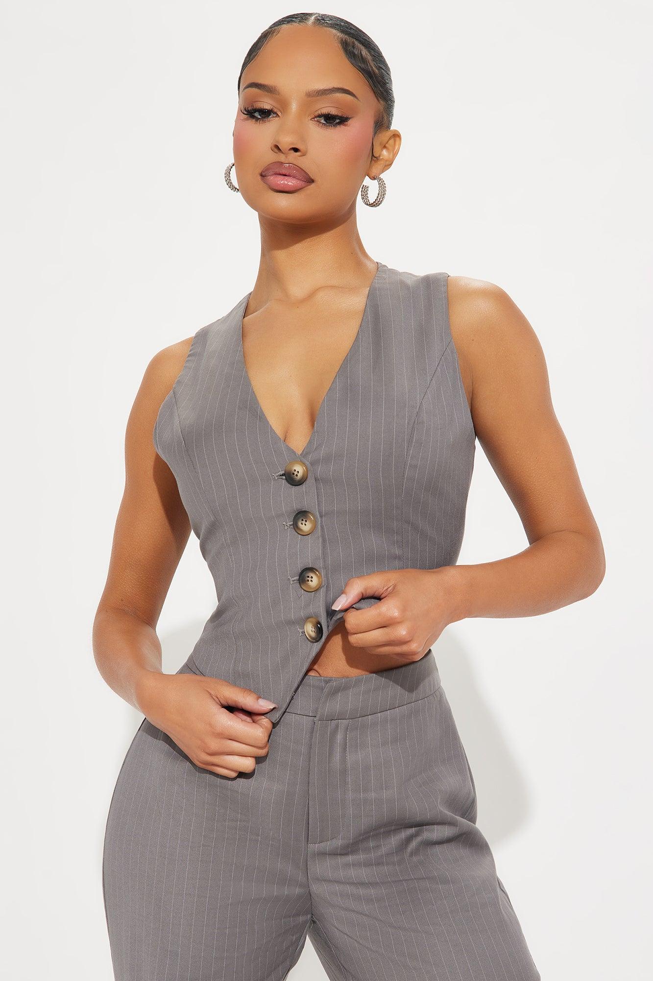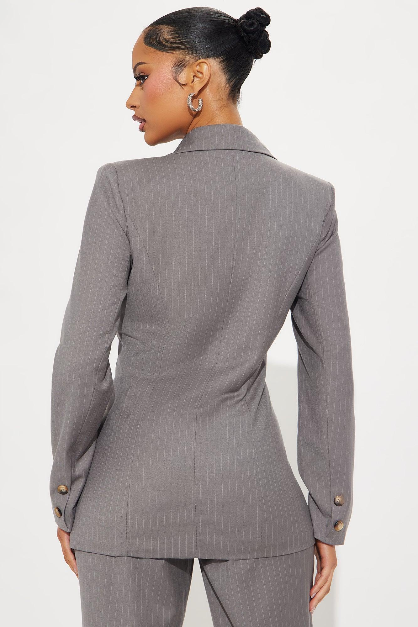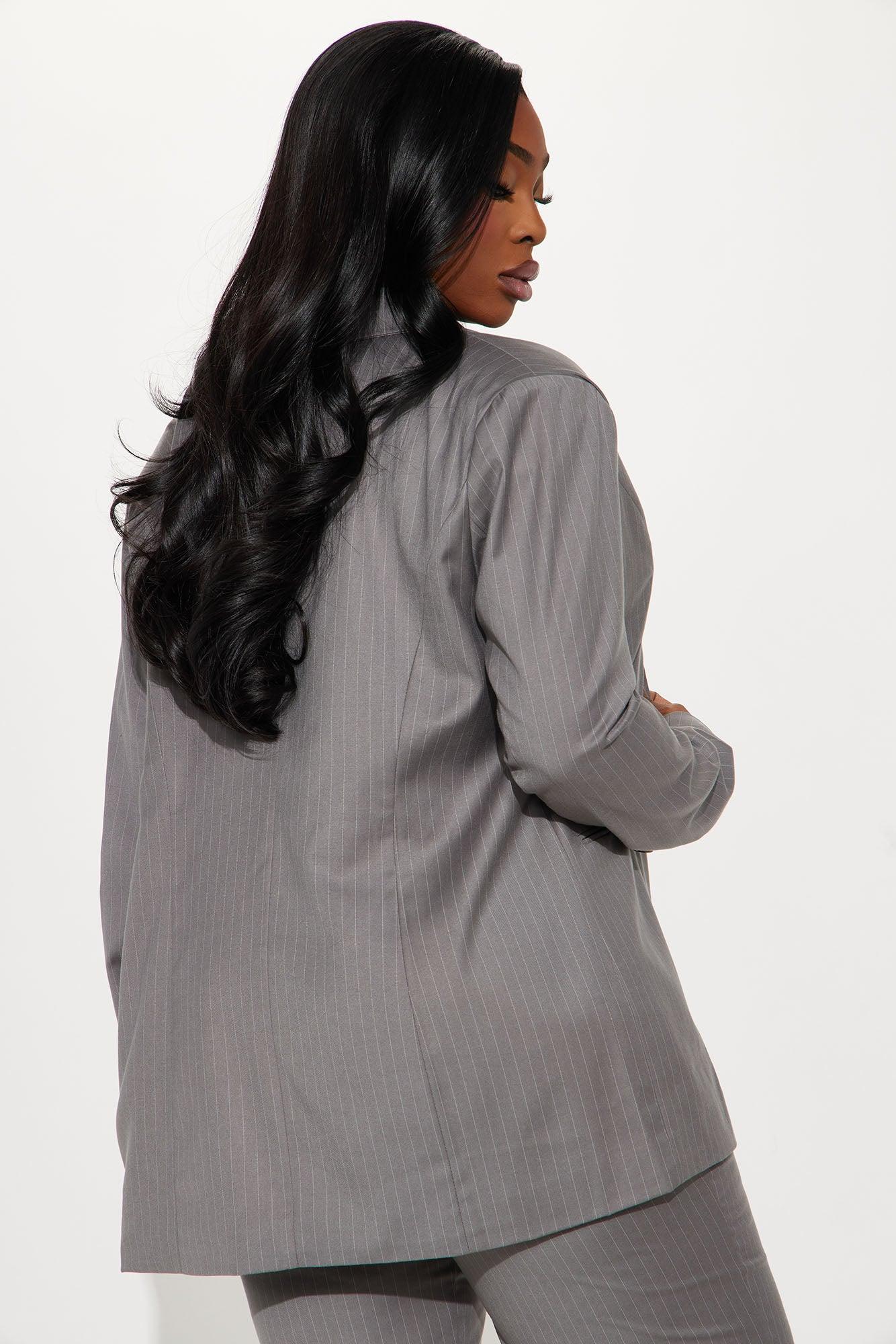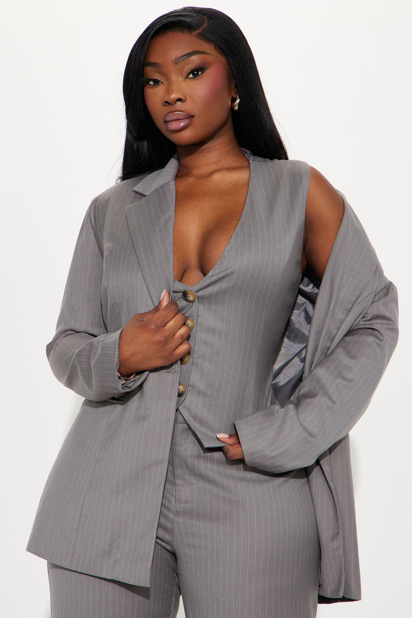 Available In Mocha And Charcoal. 2 Piece Blazer Set Oversized Blazer Lapel Collar Long Sleeve Separate Vest Crepe Woven Button Closure Faux Pockets Pinstripe Non Stretch Pair With "Lesson Learnt Pinstripe Trouser" Self: 70% Polyester 28% Rayon 2% Spandex Lining: 100% Polyester Imported