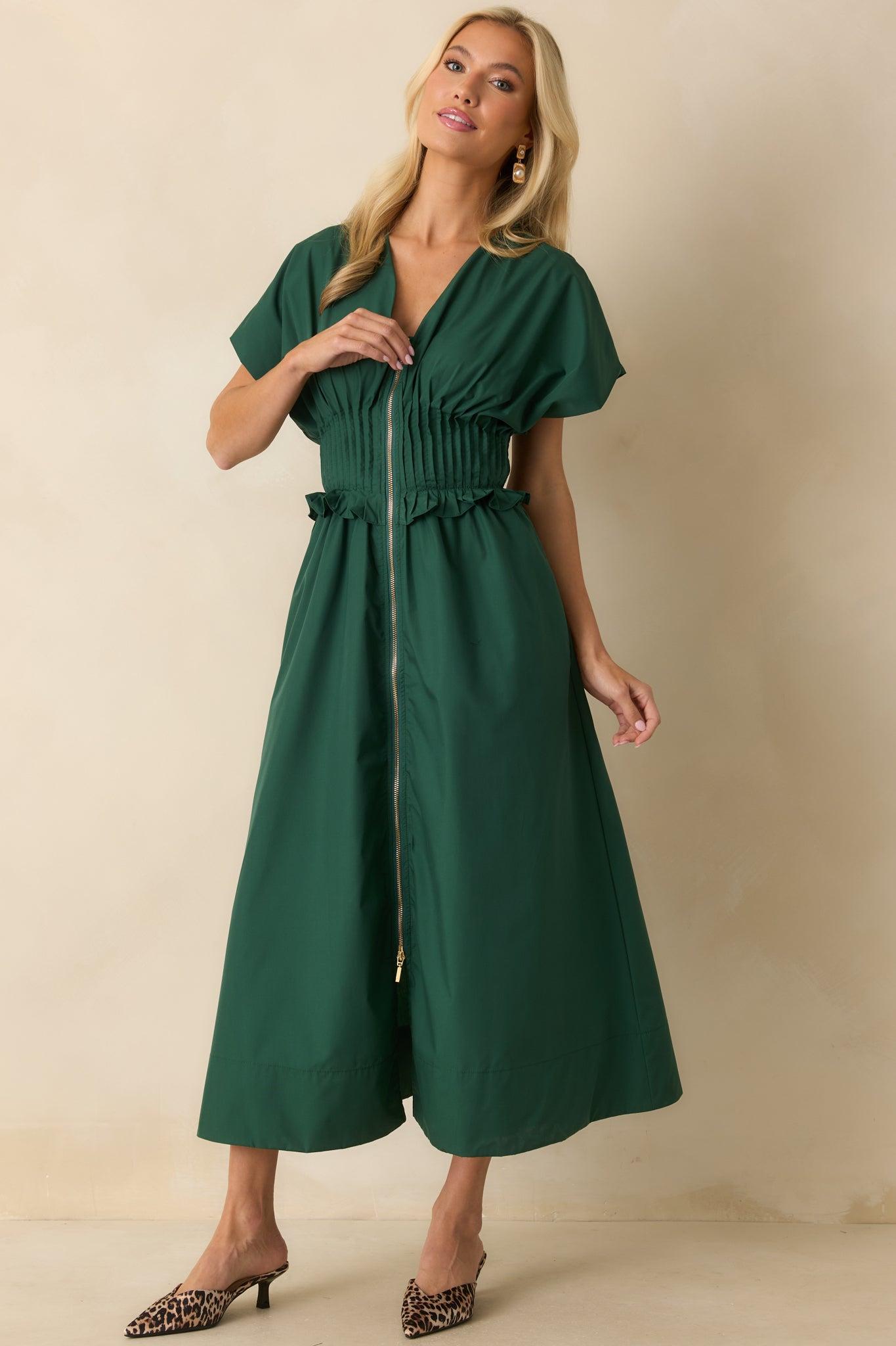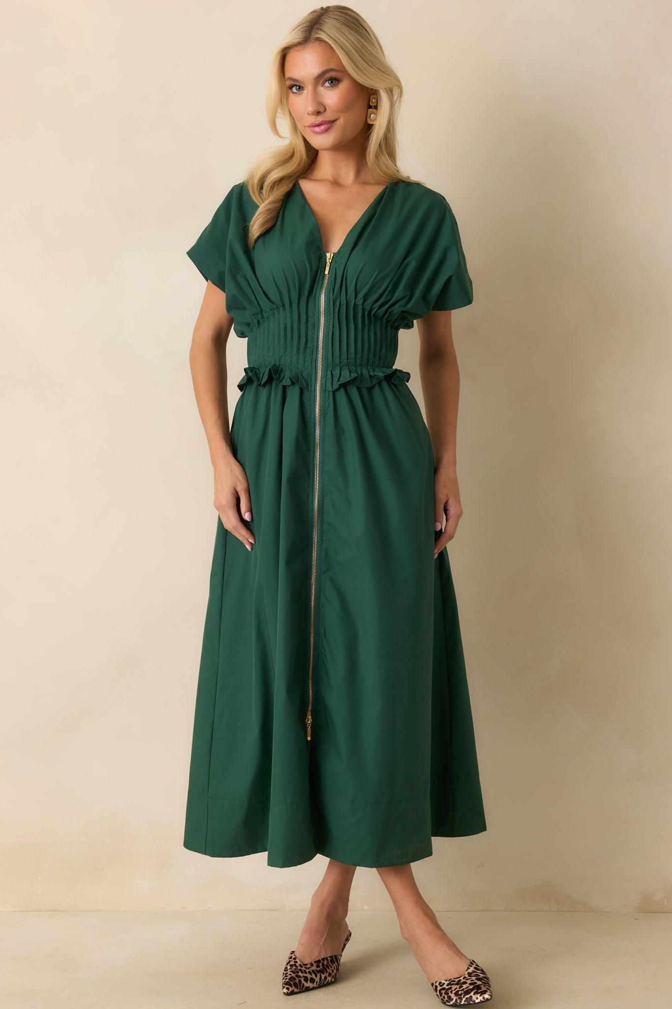 The Let It Be Easy Green Smocked Waist Zip Maxi Dress is the definition of effortless polish. Designed to flatter with a soft shape and subtle structure, it moves easily from weekday lunches to weekend plans—proof that simple can still feel special. This green woven maxi dress features a V-neckline, front zip closure, short sleeves, a wide smocked waistband with ruffled trim, side pockets, and a relaxed A-line skirt. 80% Polyester & 20% Cotton Lined: 100% Polyester Hand Wash Cold Manufactured in China Designed in The USA Model is 5'8" and Wearing a Size Small, Clipped, Model is a True X-Small