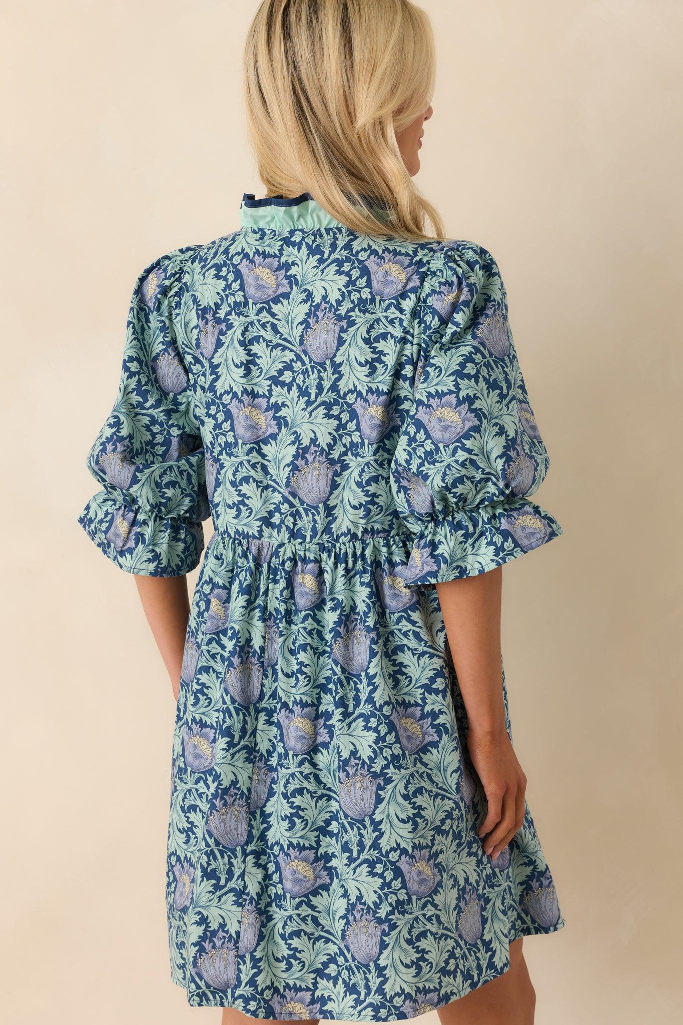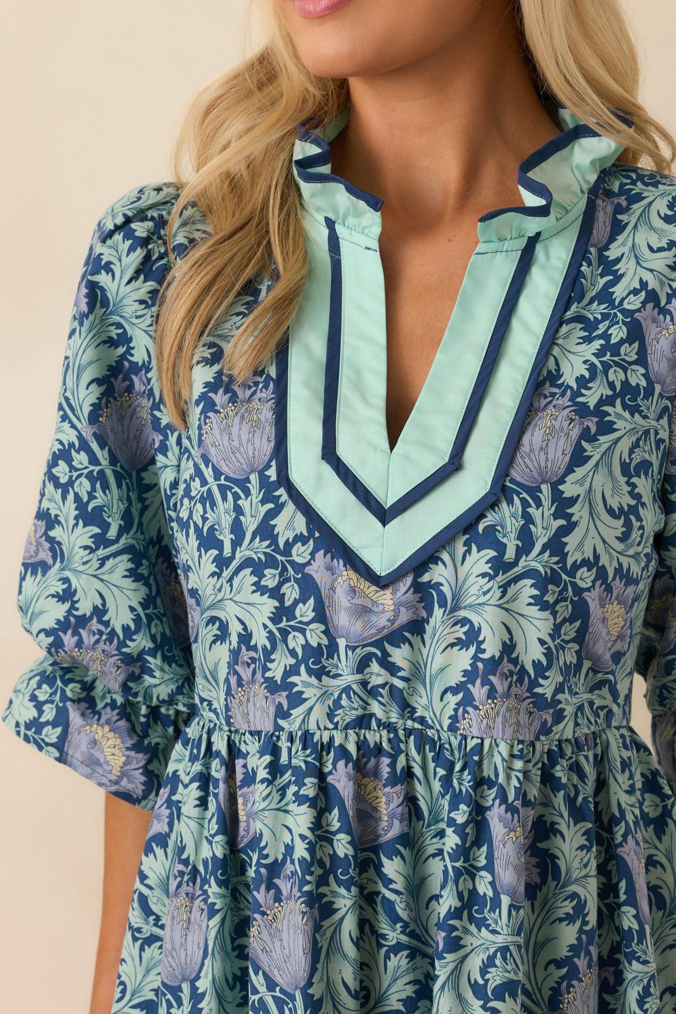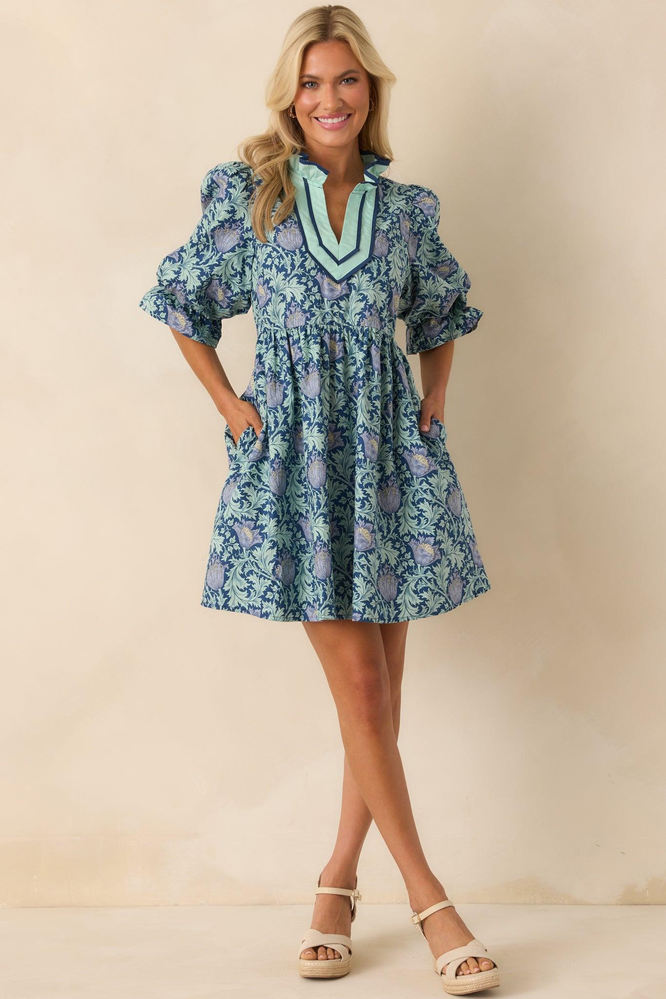 Our Let It Be Lovely Navy Multi Floral Print Cotton Mini Dress is all about leaning into the moments that feel sweet and simple. It’s effortlessly pretty, easy to wear, and always brings a little joy with it. This navy mini dress features a multicolor floral print throughout, a ruffle notch v-neckline, seafoam green and navy trim detailing, half puff sleeves, elastic cuffs, full navy lining, and functional pockets.