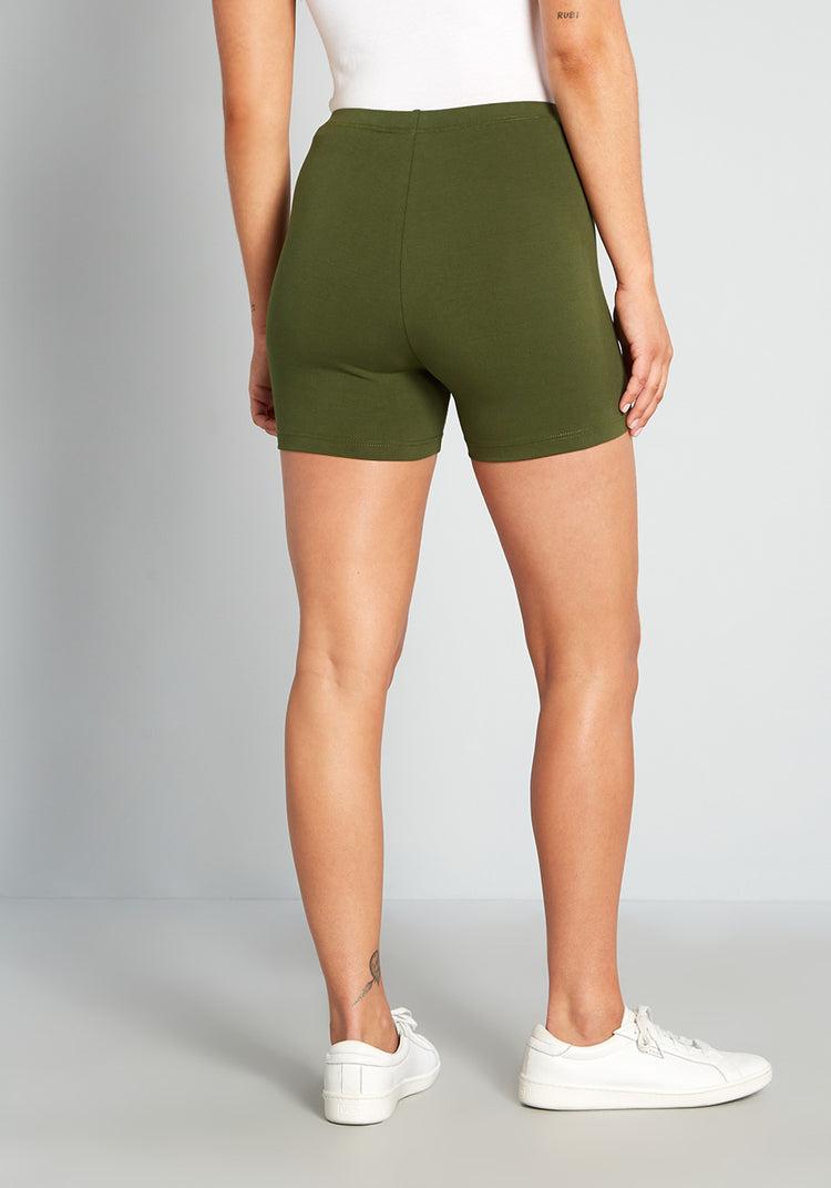 Effortless comfort and style are yours when you have these fun and functional olive green bike shorts accentuating your lounge and activewear wardrobe! Made from a stretchy cotton-blend knit, this sporty pair boasts a flattering high rise and a shorter inseam than our other biker shorts that hits at the upper thigh. These ModCloth namesake label knit shorts are sure to become a favorite piece in your ample collection of luxe basics.95% Cotton, 5% Spandex. Machine wash. Imported Fabric provides stretch. S=8 inches Rise S=3 inches Inseam 1X=11 inches Rise 1X=5 inches Inseam