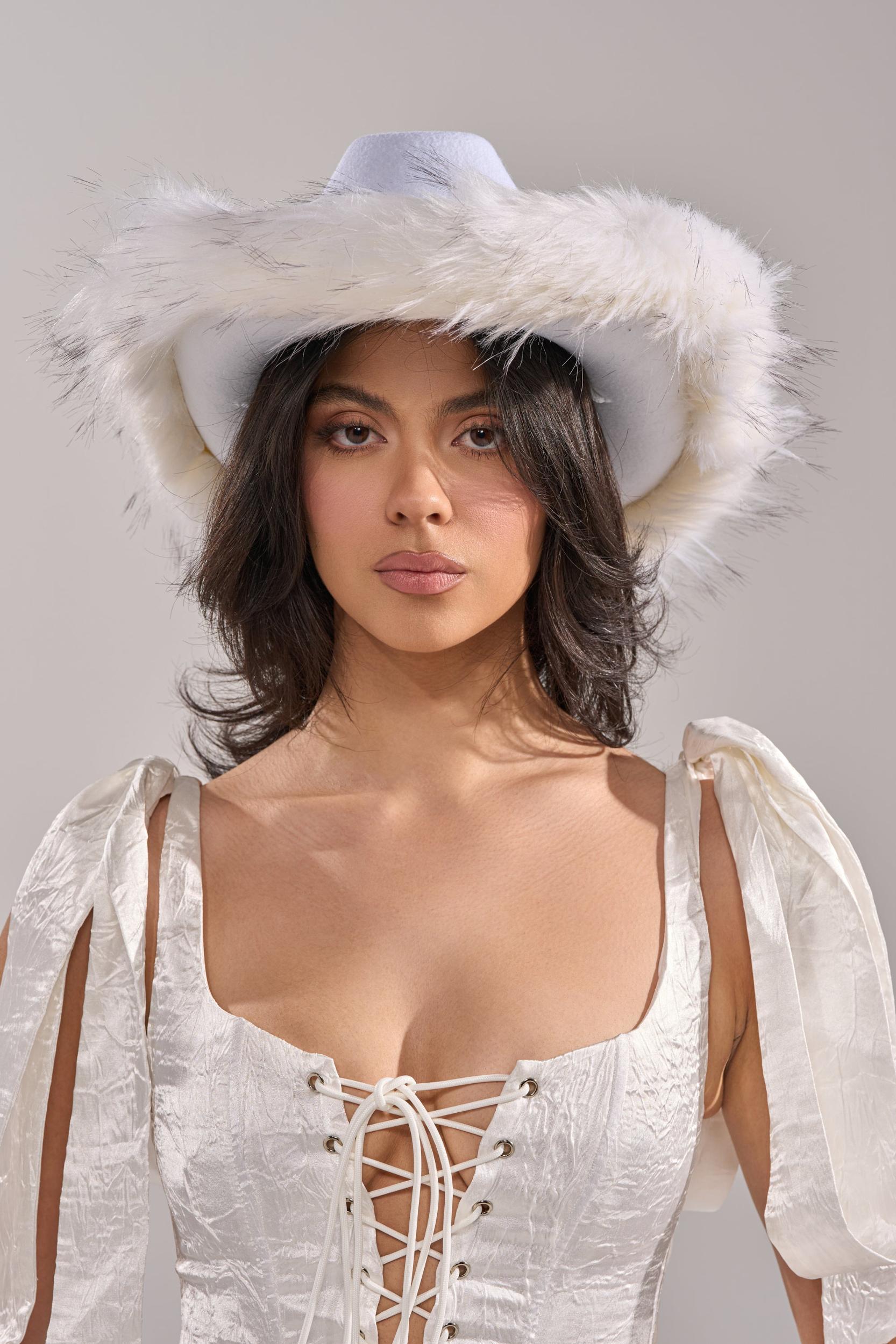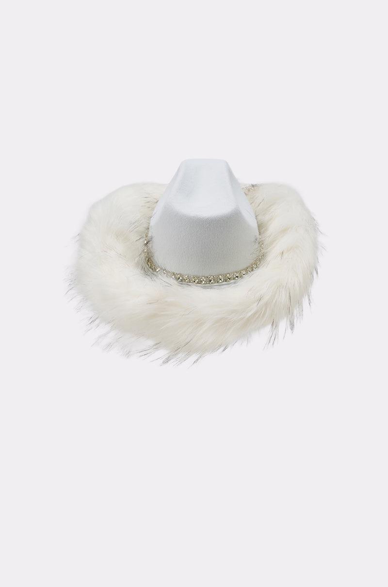 Rock a winter western look with the AKIRA Label Let’s Ride Faux Fur Trim Cowboy Hat! Featuring a soft felt crown accented by a sparkling rhinestone band and surrounded by plush faux fur trim, this statement winter hat adds instant elegance to any outfit, from holiday looks to après-ski and festival ensembles. Perfect for chic winter fashion, costume styling, or standout accessories, this glamorous faux fur hat with ties for security blends comfort, sophistication, and eye-catching shine for a bold yet timeless seasonal accessory. - Faux Fur: 92% Acrylic 8% Polyester, Hat Base: 100% Polyester- Imported (all measurements are approximate from size O/S)- 23” Head Circumference- 8.5” Head DiameterProduct ID: 1081882