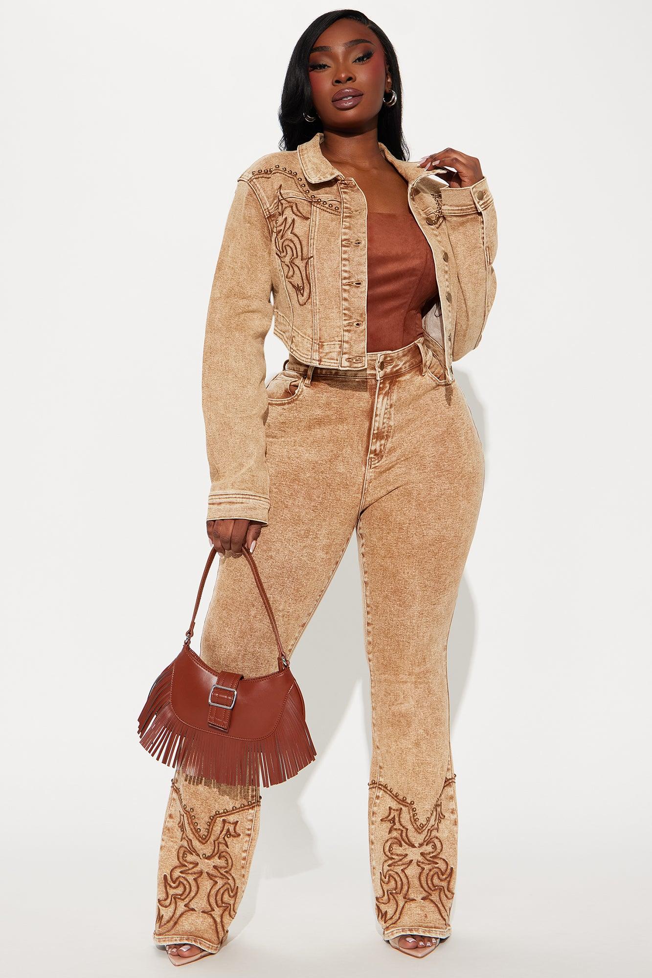 Available In Brown. Pair With Let It Rise Stretch Embellished Flare Jeans Denim Jacket Button Closure Rhinestone Detail Collared Long Sleeve Medium Stretch Disclaimer: Due To The Specialized Wash Process, Each Garment Is Unique. 55% Cotton 33% Polyester 10.5% Viscose 1.5% Spandex Imported California Proposition 65WARNING: Cancer and Reproductive Harm - www.P65Warnings.ca.gov.
