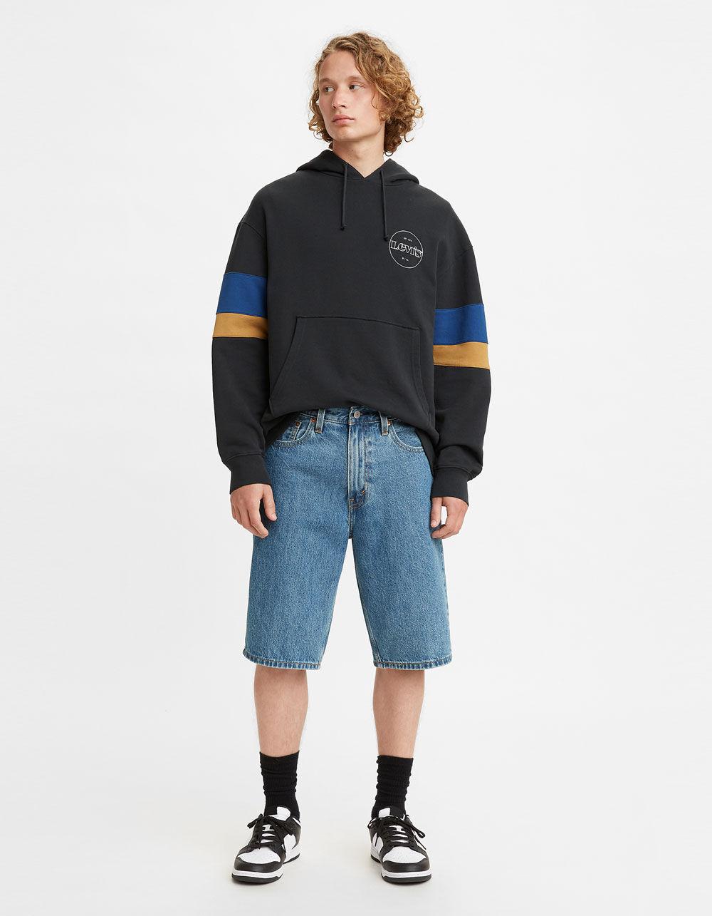 Levi's 469 Loose Denim Shorts. The '90s are back—and in a big way. Meet Levi's 469 Loose Shorts. They channeled the bold style of the decade into a pair of ultra-comfy, perfectly loose shorts. Clean-edge hem. Loose through the seat and thigh. Sits at your waist. Wide leg. 5-pocket denim styling. Button closure with zip fly. Belt loop waist. Front rise: 12 1/8". Leg opening: 22" (measurements based on size 32). 12" inseam. 100% Cotton. Machine wash. Imported.