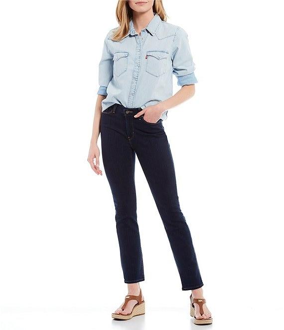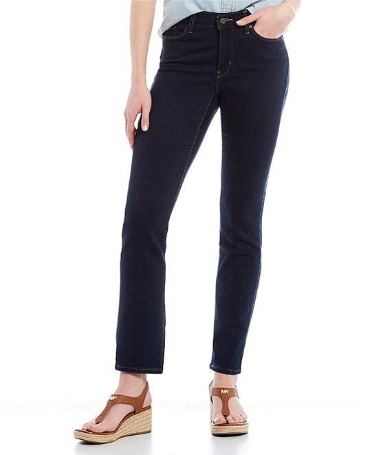 From Levis, these jeans feature:Stretch denim fabricationMid rise waistbandFront button/zip closurebelt loops5 pocket stylingStraight leg silhouetteApprox. 9.5 front rise; 15.25 back rise; 14.25 leg openingApprox. 28 short inseamApprox. 30 regular inseamApprox. 32 long inseamCotton/polyester/viscose/elastaneMachine wash/dry inside outImported.