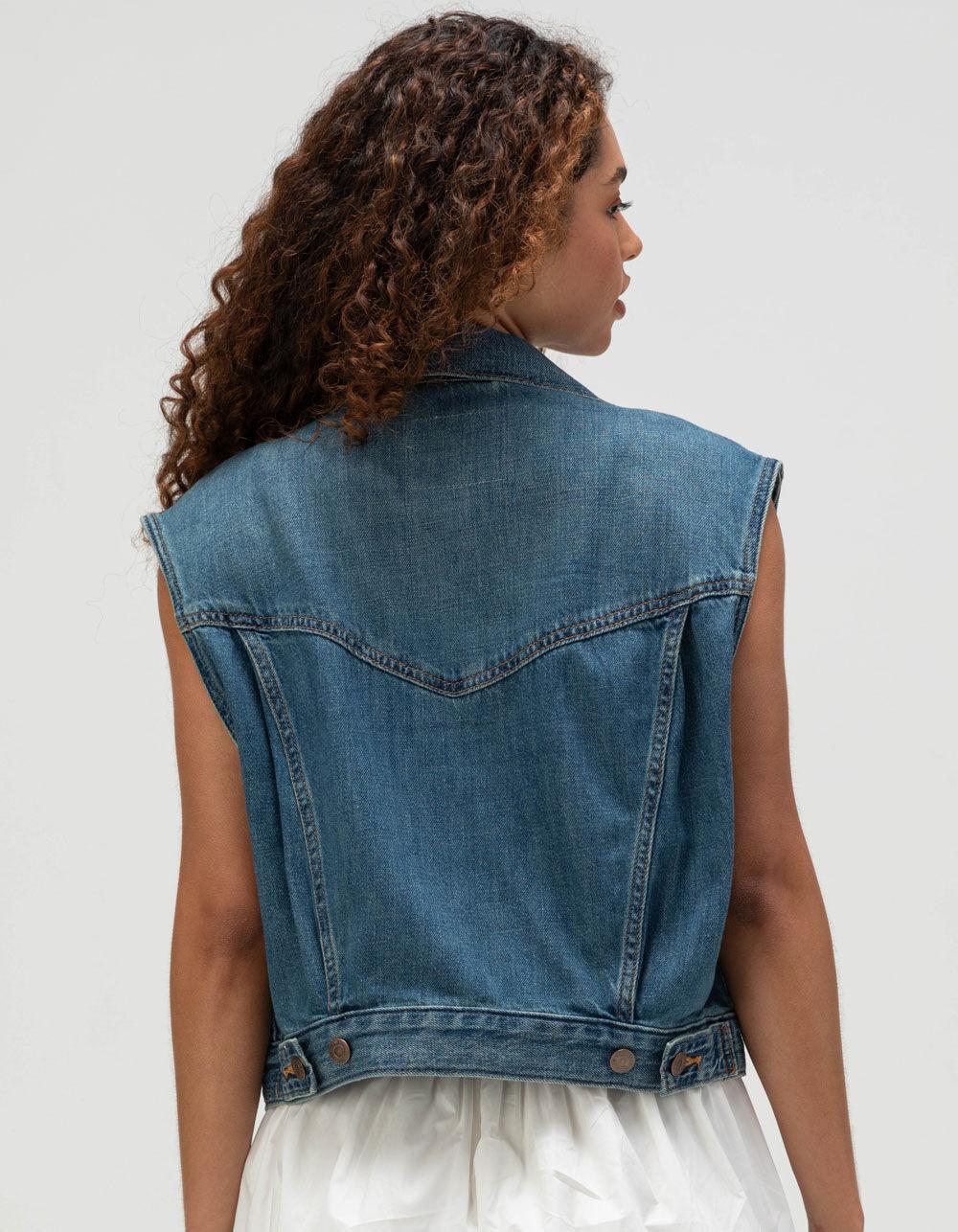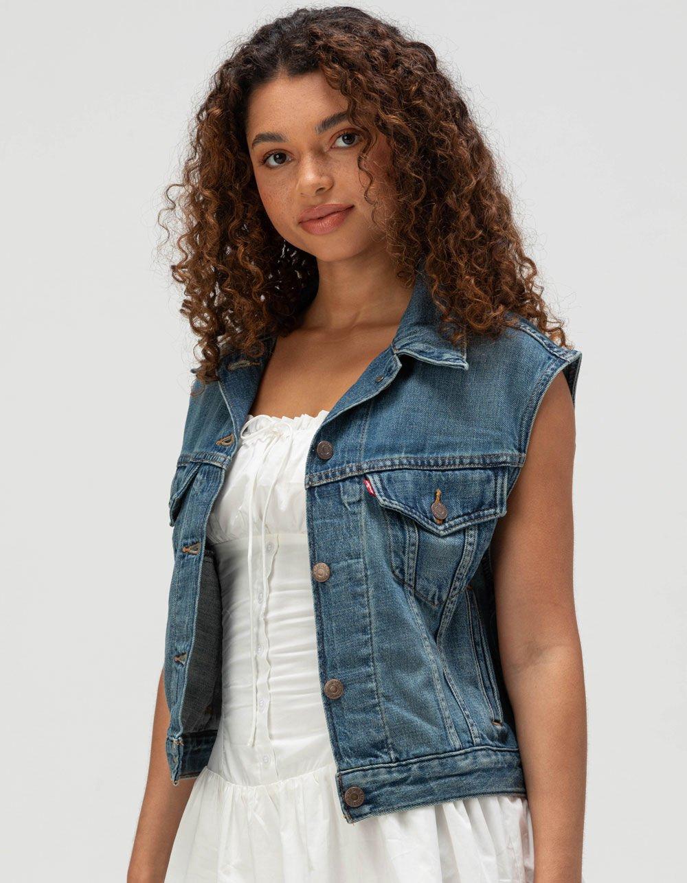 VINTAGE MED. Levi's Premium Shrunken '90s Linen + Denim Vest. The iconic Shrunken '90s Trucker Jacket gets a fresh update as a vest, offering an effortlessly cool style with a versatile shape and ideal weight. The throwback design features a pitched silhouette, capturing the distinctly ‘90s vibe. This vest is crafted with a unique two-flap pocket design and a cropped, relaxed fit that makes it a timeless piece. It’s the perfect blank canvas for self-expression and is built to last, becoming even better with natural wear over time. Made with linen to keep you feeling comfortable and looking great, it combines airy breathability with lightness. Constructed from 85% cotton and 15% linen. Machine wash. Imported.