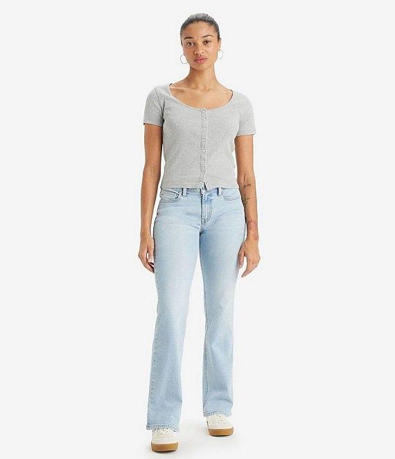 From Levi's®, these jeans feature: Super low rise Fitted through through the hips and thighs Zip/button-front closure Belt loops 5-pocket styling 2 front pockets (1 with coin pocket) 2 back pockets Bootcut legs Cotton/polyester/Lycra® spandex denim Machine wash/tumble dry Imported.