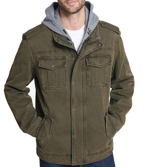 From Levi's®, this jacket features: Point collar plus attached hood Long sleeves Dual front closure; zipper and snaps Adjustable snap cuffs Epaulets on shoulders Underarm gusset design Levi's® red tab on left chest pocket Two chest flap pockets Zip out jersey bib/ hood and sherpa lining Two lower faux flap pocket with side enter and one internal welt pocket with snap closure Cotton Machine wash/tumble dry Imported.