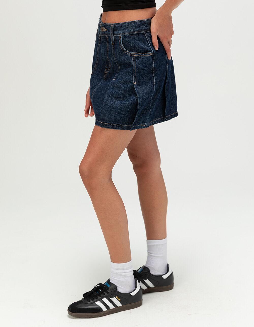 Levi's Pleated Mini Skirt - Remember Together. A flattering mini skirt that adds a touch of polish. Levi's Pleated Mini Skirt sits right at your waist and features a mini length with a tailored, pleated design. 5-pocket styling. Mid rise - CF: 14.5". Button closure with zip fly. 95% Cotton 5% Recycled Cotton. Machine wash. Imported.