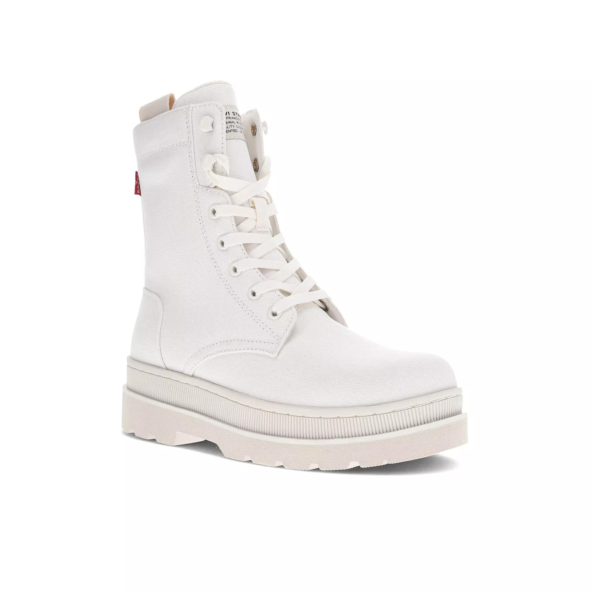 Refresh your style with this Levis Eliana Neo Womens Canvas Boots.Click this FOOTWEAR GUIDE to find the perfect fit and more! Refresh your style with this Levis Eliana Neo Womens Canvas Boots.Click this FOOTWEAR GUIDE to find the perfect fit and more! FEATURES Durable vegan coated canvas fabric upper Removeable insoleCONSTRUCTION Canvas upper Fabric lining Polyurethane midsole Rubber outsole Foam footbed Lug outsoleDETAILS Plain toe Lace-up Closure 2-in. platform height 7-in. shaft height 10-in. shaft circumference Spot clean Imported Size: 9. Color: White. Gender: female. Age Group: adult.