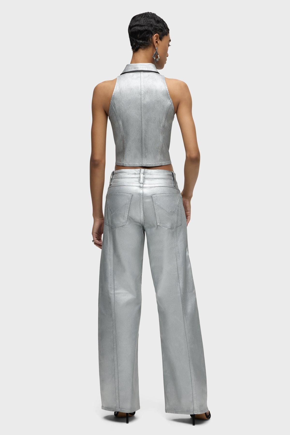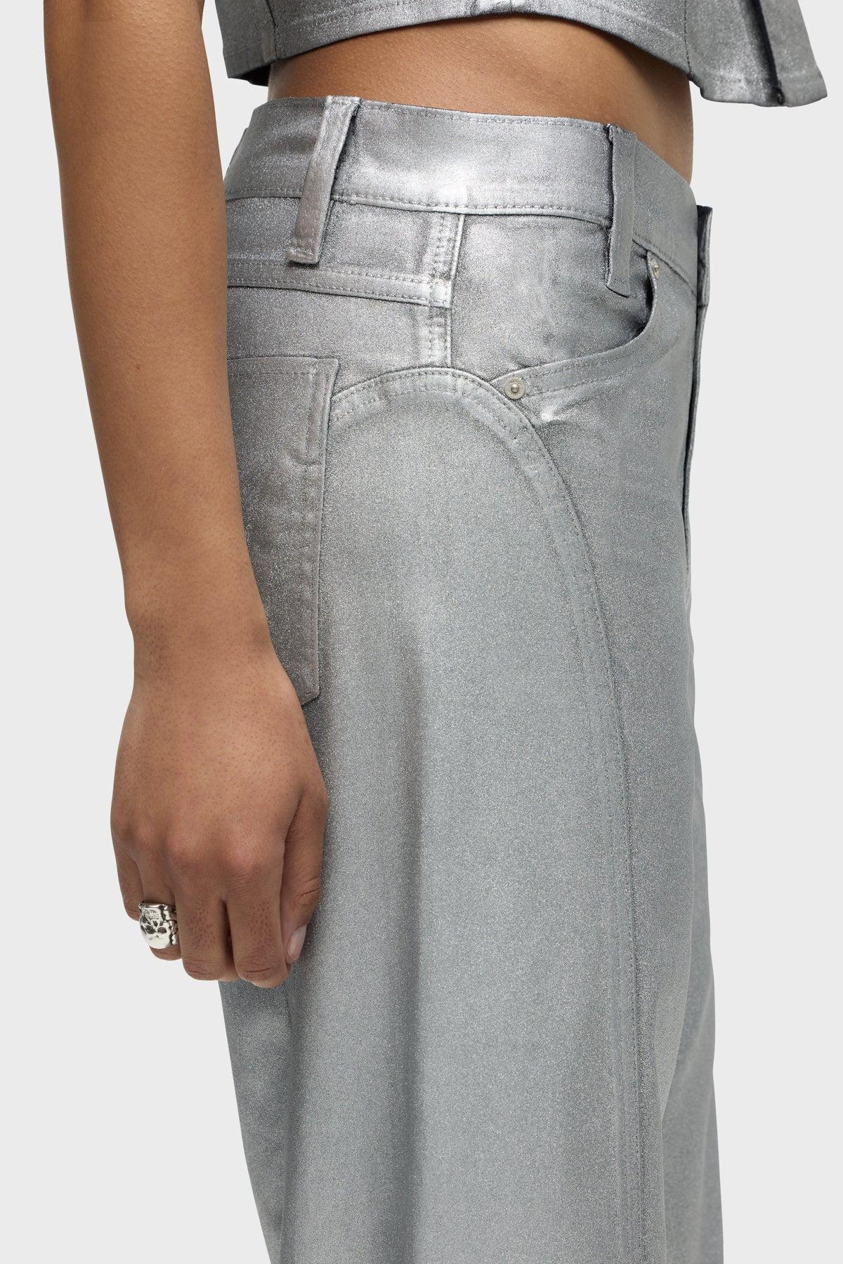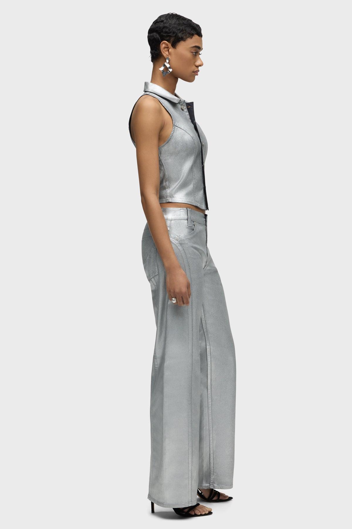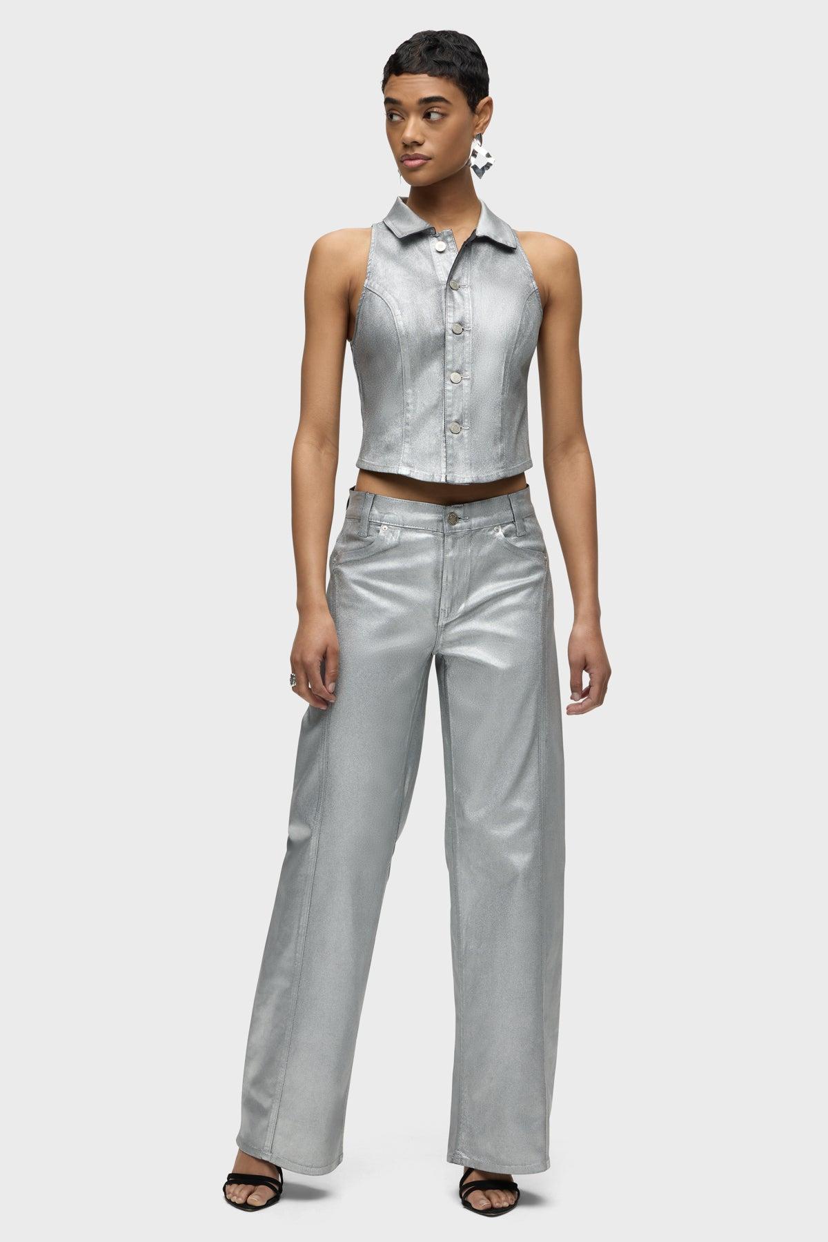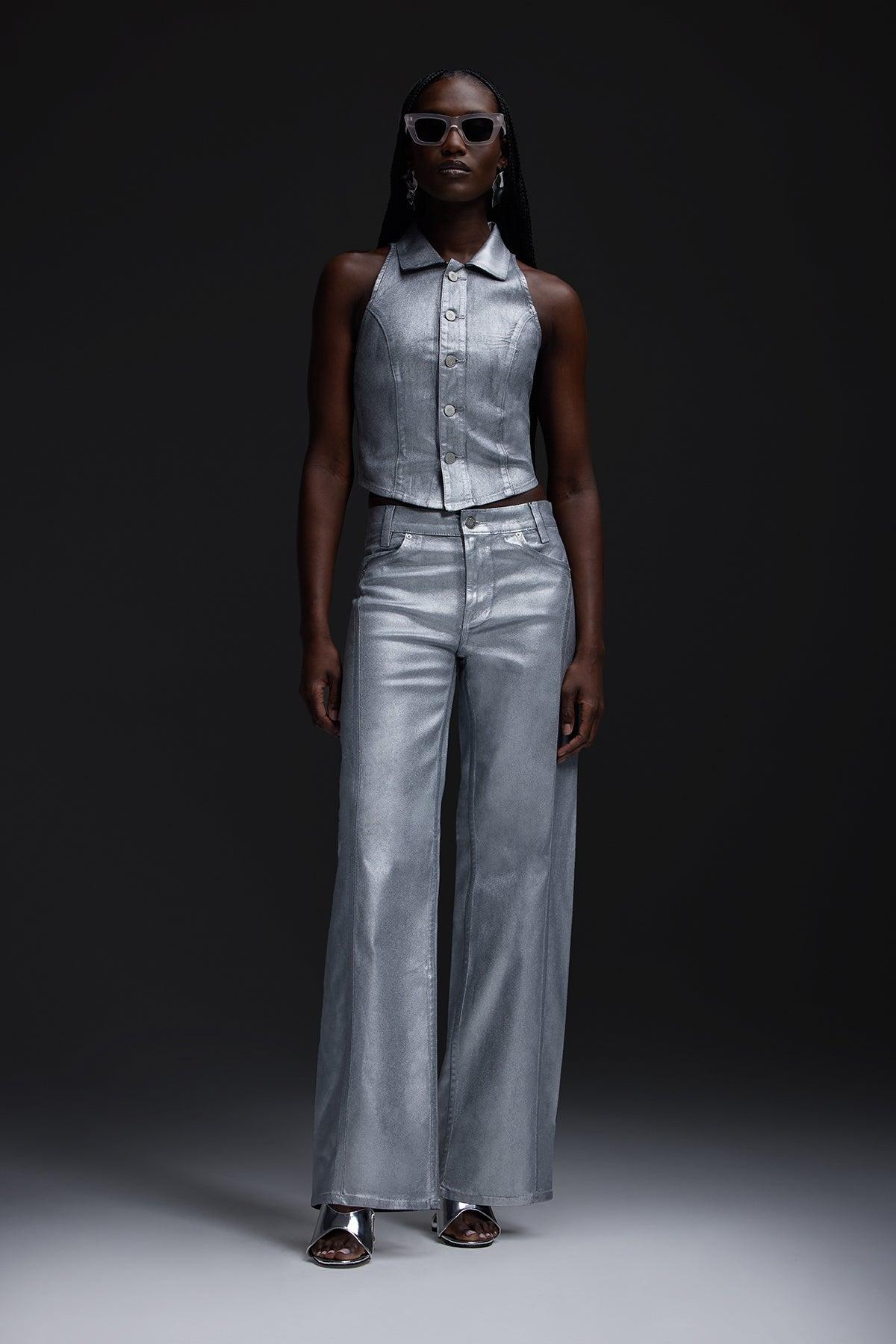 Description The Lexi Mid-Rise Coated Seamed Wide Leg is a star in a Matte Silver Foil. It features a curved outseam panel for a modern touch on the wide leg. Traditional pocketing and a silver foil coating complete the overdyed black wash. Product Details Front Rise: 10.25", Leg Opening: 22", Inseam: 32"Model Height 5'9"Model wearing size 25Measurements based on size 27 Fit & Care Content: 79% Cotton, 18% Modal, 3% ElastaneMachine wash cold with like colorsDo not bleachTumble dry low or hang to dry