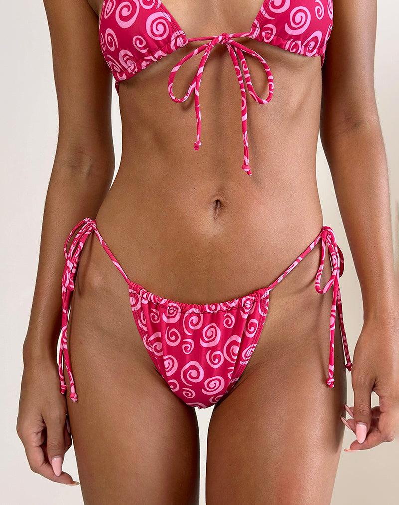 Leyna bikini bottom in mini swirl pink features a micro, high-rise silhouette and adjustable tie straps with ruched detailing to secure the perfect fit. Pair with the matching Pamita bottoms. MODEL WEARS SIZE:EXTRA SMALL - MODEL HEIGHT:5'6.5