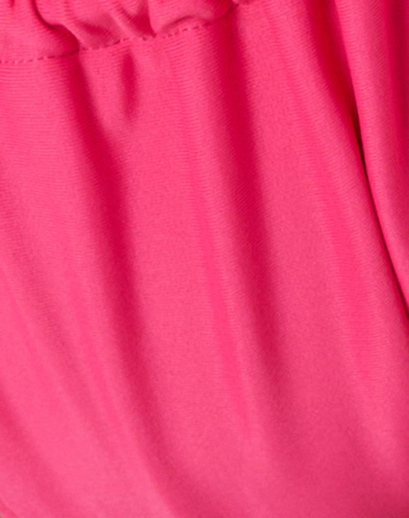 Low rise bikini bottoms with adjustable ties at each side and ruching on the front and back for adjustable coverage in a hot pink colourway, cut from a stretch swim spandex made from recycled materials and finished with multiple blue shimmer beads at the end of each tie. Complete the look with the matching Pami top. MODEL WEARS SIZE: SMALL - MODEL HEIGHT:5'8