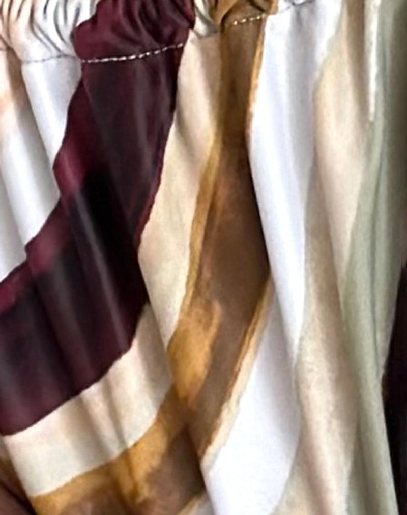 Low rise bikini bottoms with adjustable ties at each side and ruching on the front and back for adjustable coverage in an abstract stripe in neutral tones with green and orange hues cut from stretch swim spandex made from recycled materials. Pair with our Pami Bikini Top. MODEL WEARS SIZE: EXTRA SMALL - MODEL HEIGHT:5'7