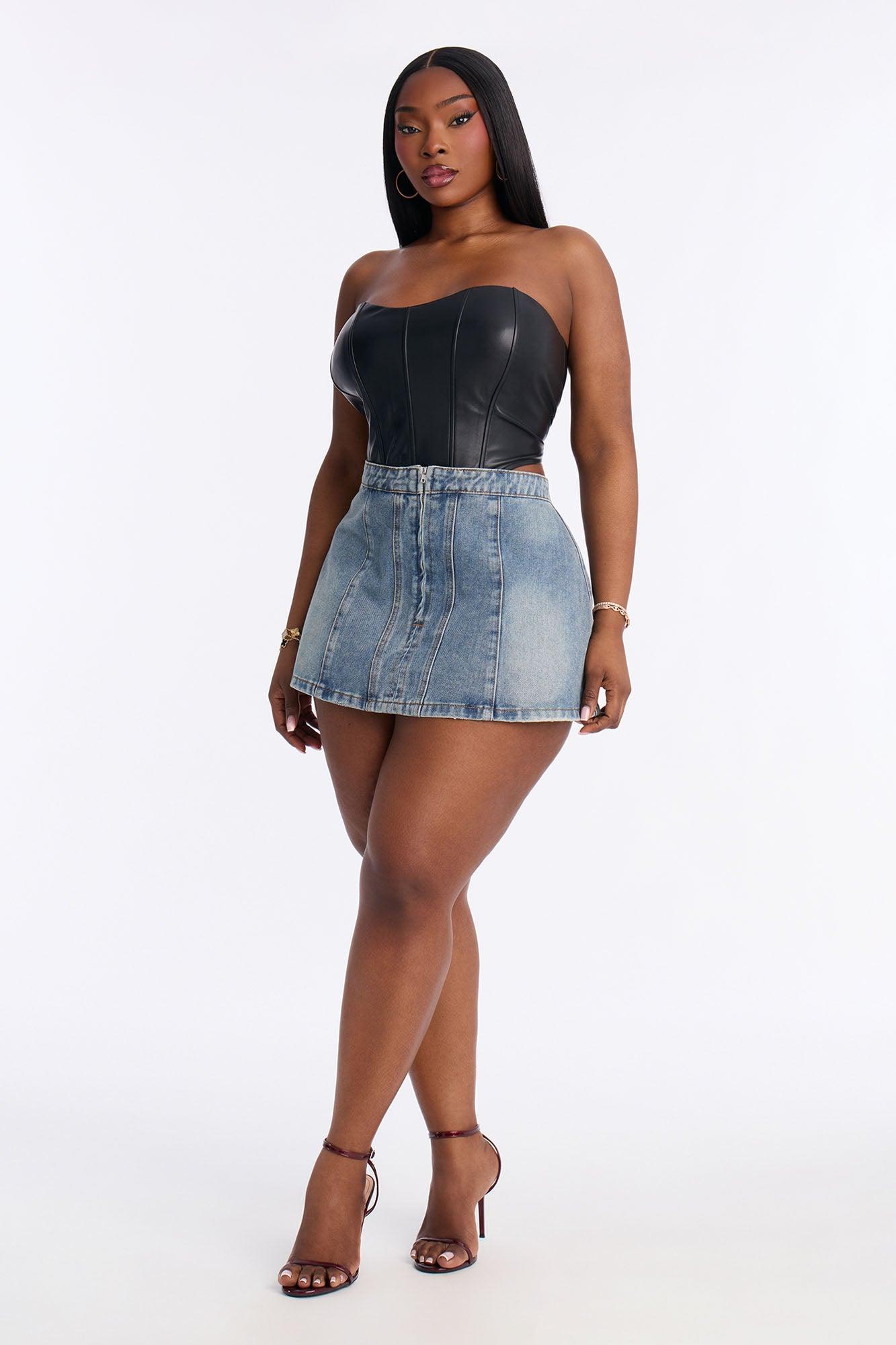 Available In Vintage Wash. Mini Skirt Zipper Closure High Rise Denim Rigid Non Stretch 12" Length Disclaimer: Due To The Specialized Wash Process, Each Garment Is Unique. Shell: 49% Cotton 40% Polyester 7% Rayon 2% Modal 2% Nylon Imported