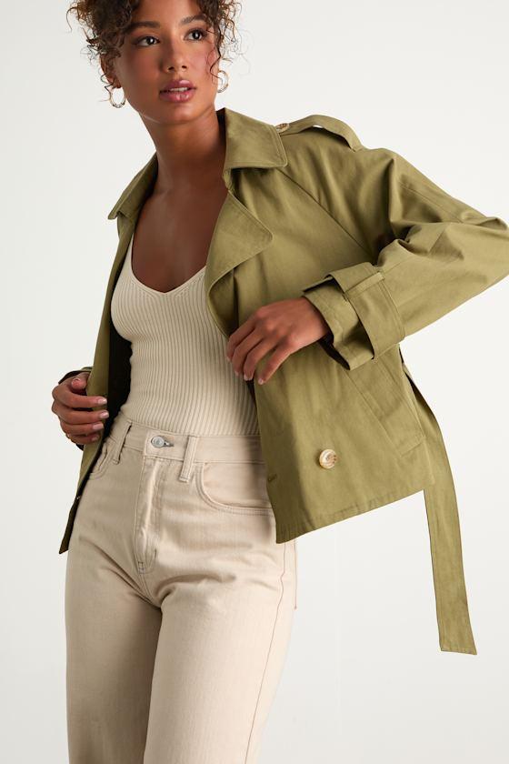 The Lulus Lianna Green Cropped Trench Coat will turn breezy spring days into extra stylish ones! Lightweight woven fabric shapes this chic cropped coat that has long sleeves with cinching straps at the cuffs and shoulders, framing a collared neckline with notched lapels. The trench coat-style bodice has two functional front buttons that secure the double-breasted silhouette, while belt loops and a tying sash belt create a customizable fit. Convenient side pockets complete the look.