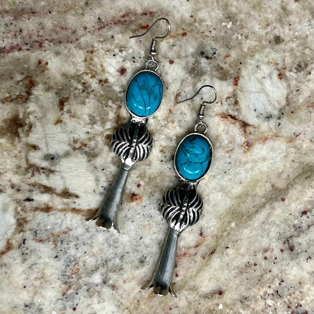 The Liberty Earrings are a 2 1/2" silver dangle earring with a flared silver bottom and a small turquoise stone set in the silver spider looking design. They are on a fish hook back. They are 2 1/2" in total length.