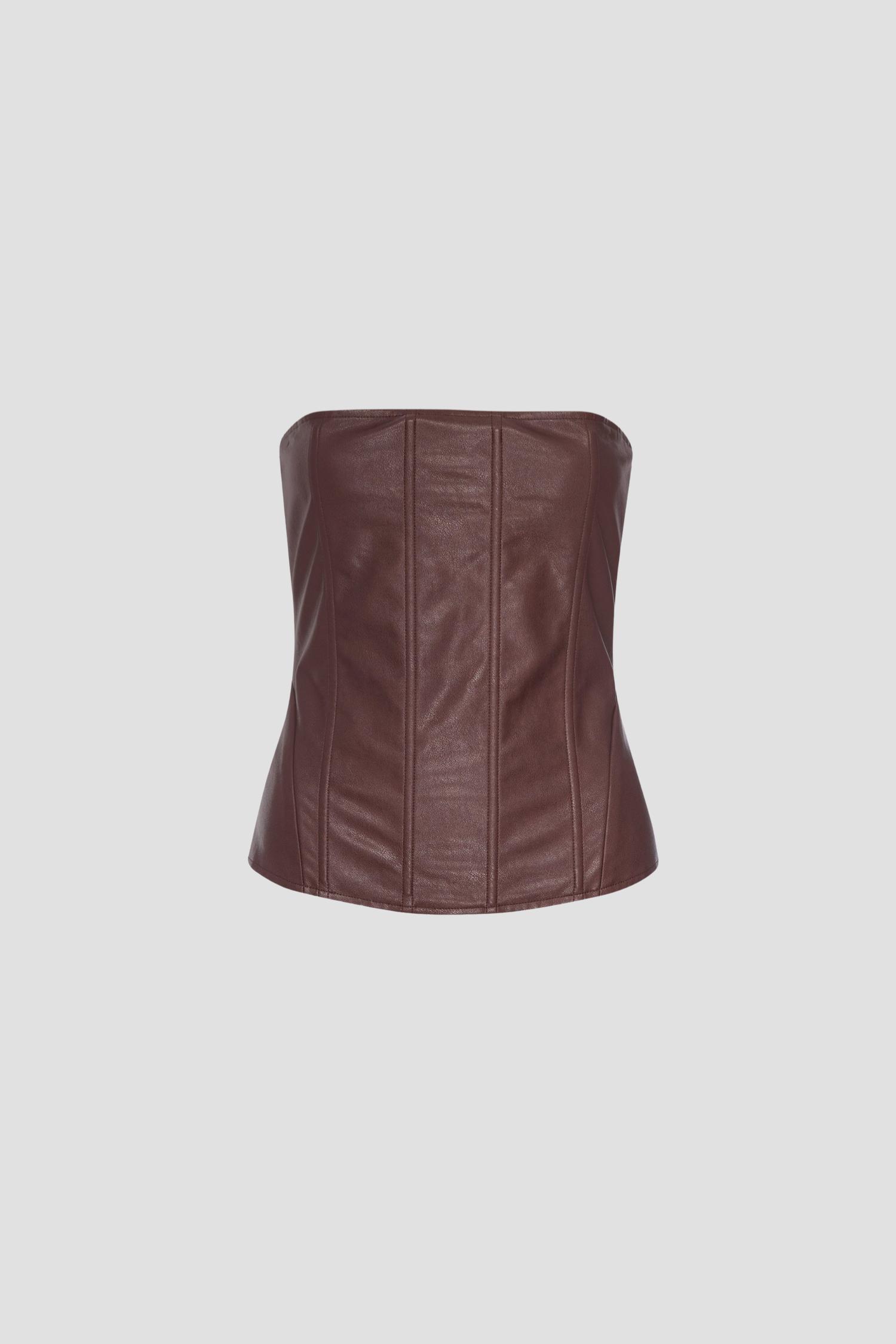 Embrace bold sophistication with the Libra Corset in brown vegan leather. Designed with a structured fit and a sleek silhouette, this corset is a versatile piece that adds an edgy, luxe touch to any look. Style it with jeans, a matching leather piece from our collection, or layer it for instant drama.