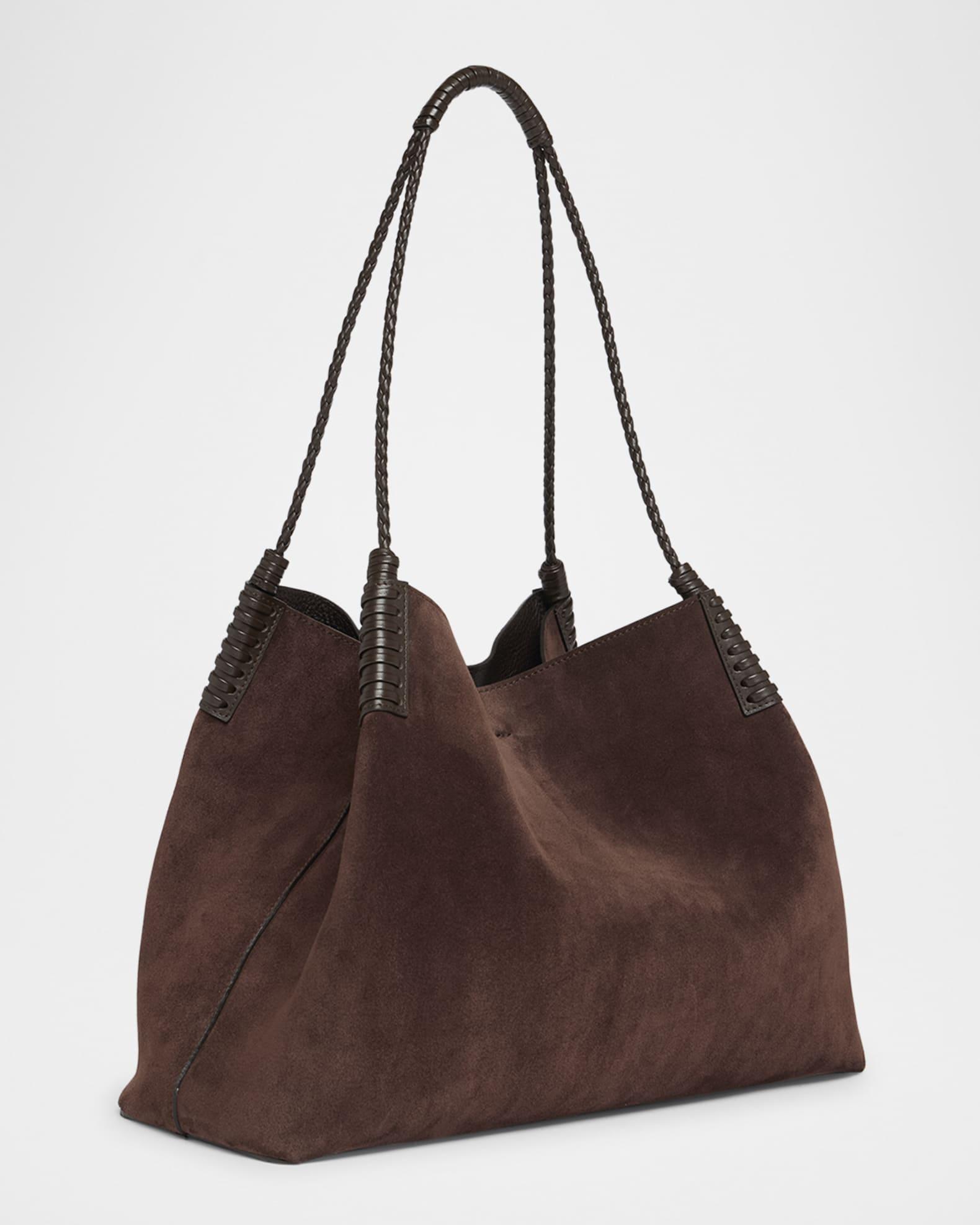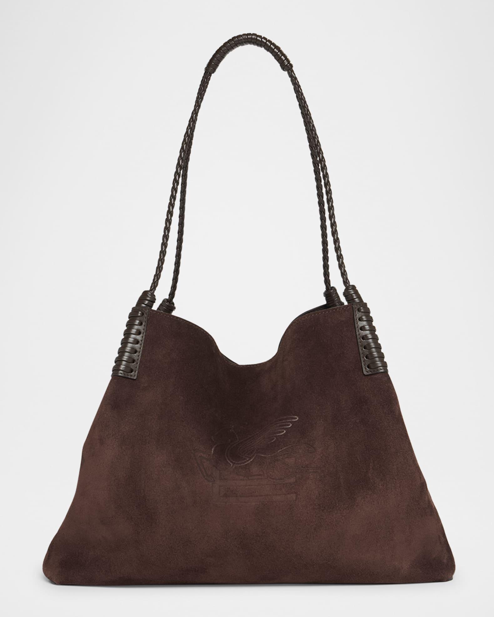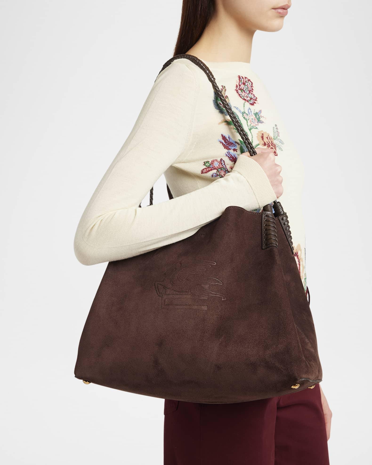 Made of suede, the "Libra" shopper tote bag from Etro features a slouchy silhouette and embossed monogram Pegaso detail Braided leather shoulder straps Open top with push-lock closure Interior, removable flap-top wristlet pouch Feet protect the bottom of the bag Approx. 15.4"H x 11.4"W 6.3"D Made in Italy
