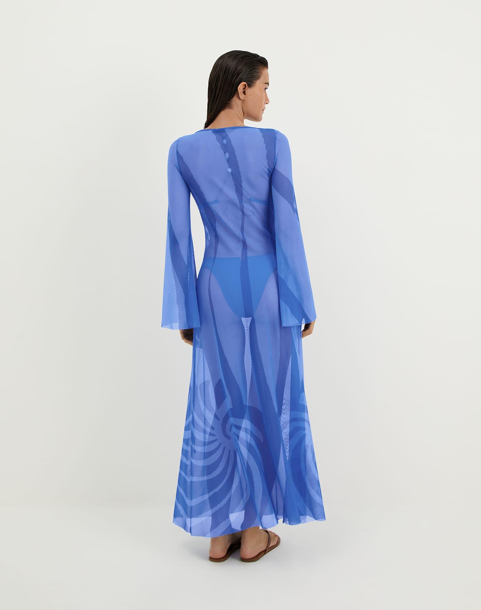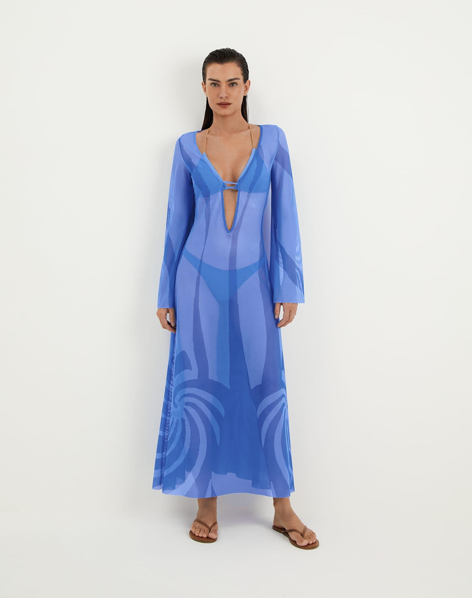 The ViX Lidi Long Cover Up Tunic is a soft mesh midi dress designed for effortless elegance. It features a plunging V-neckline, long flared trumpet sleeves, and a keyhole detail below the bust for a flattering, refined look. Perfect for a seamless transition from the beach to brunch. Style the Lidi Long Cover Up Tunic