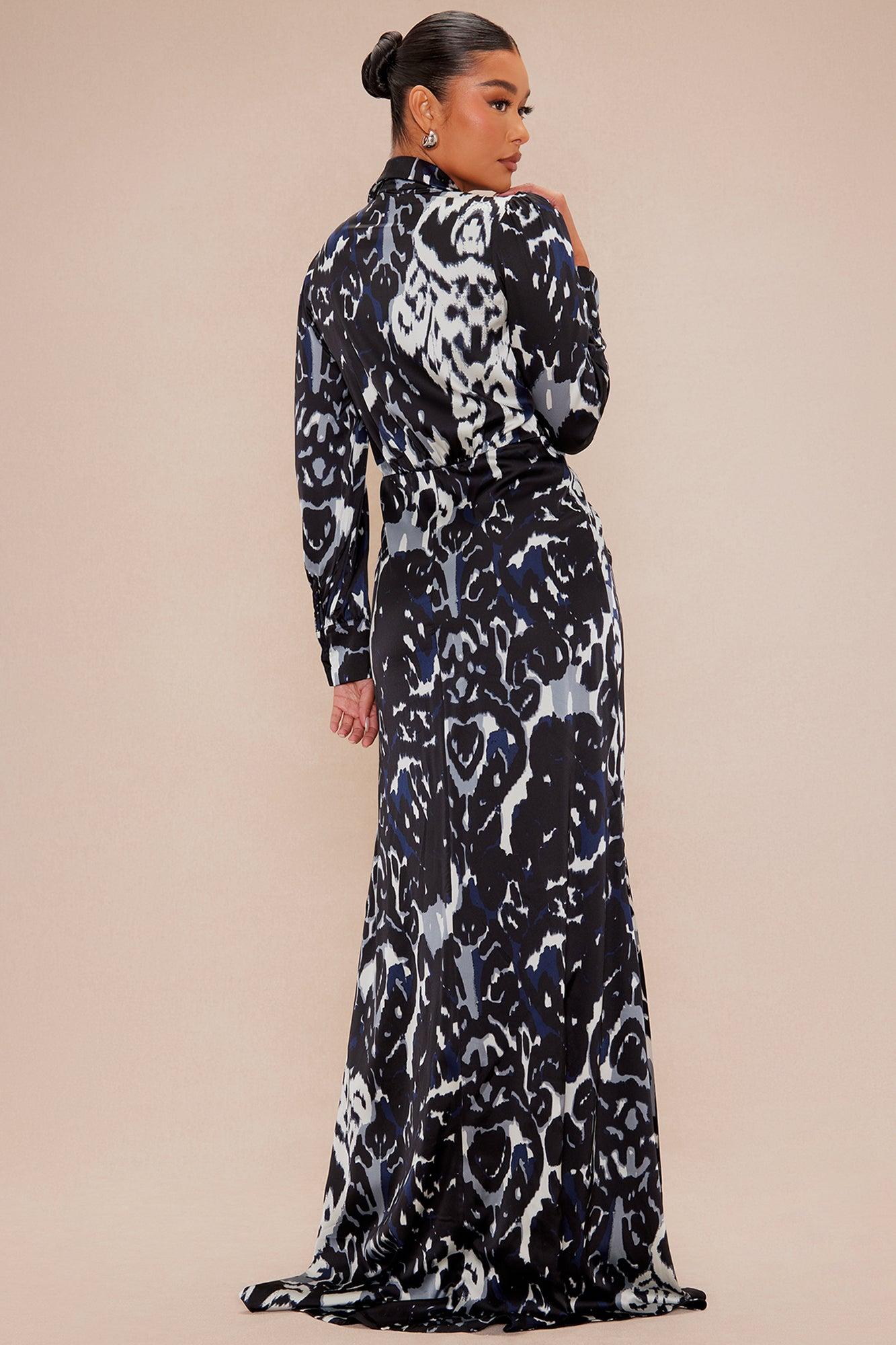 Available In Fuchsia/combo And Black/combo. Maxi Dress Collar Long Sleeve Front Twist Detail Slit Abstract Print Hidden Zipper Closure Satin Non Stretch Disclaimer: Print Placement May Vary Self: 96% Polyester 4% Spandex Lining: 96% Polyester 4% Spandex Imported