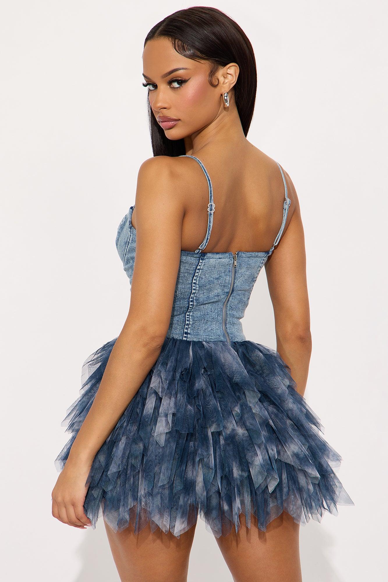 Available In Denim. Denim Micro Mini Dress Adjustable Spaghetti Straps Sweetheart Neckline Bra Cups Corset Waist Tulle Tiered Skirt Exposed Back Zipper Stretch Length Measured Flat = 30" Shell1: 75%Cotton 23%Polyester 2%Spandex Shell 2 & 3/Lining: 100% Polyester Imported